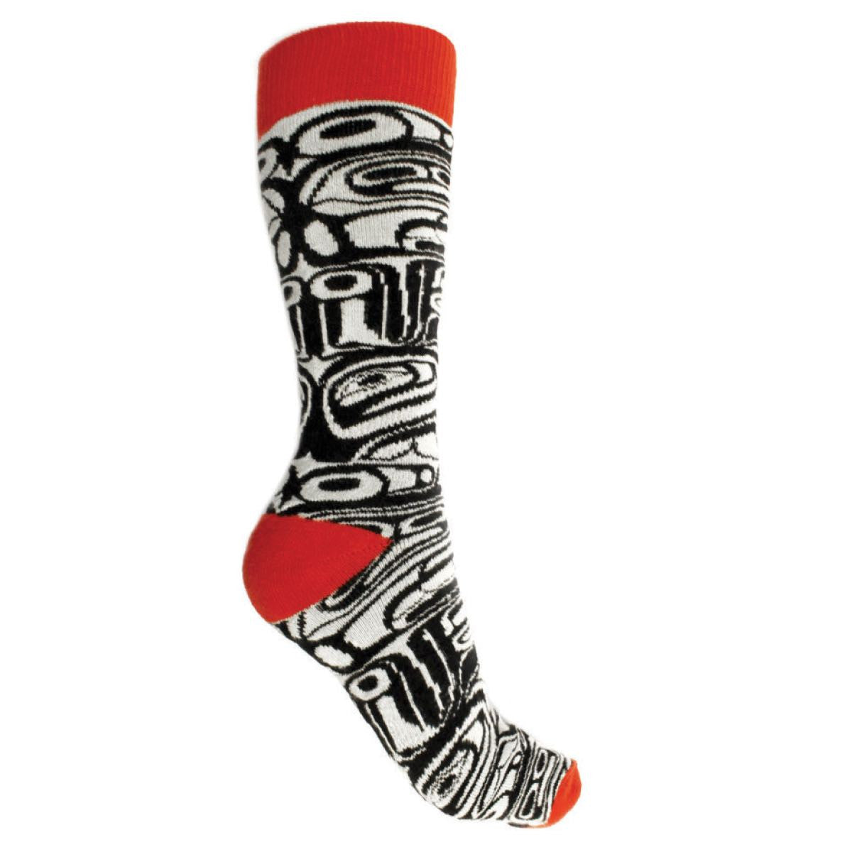 Thick, heavy-weight cotton blend mid-calf socks with knitted design After the Storm by Haida artist, Corey Bulpitt are perfect for keeping cold feet toasty warm.