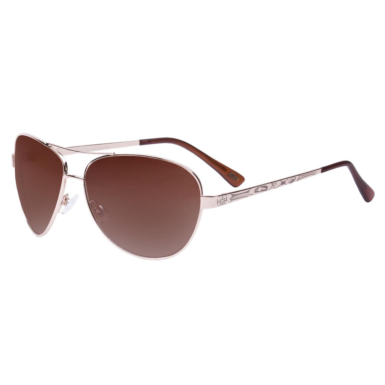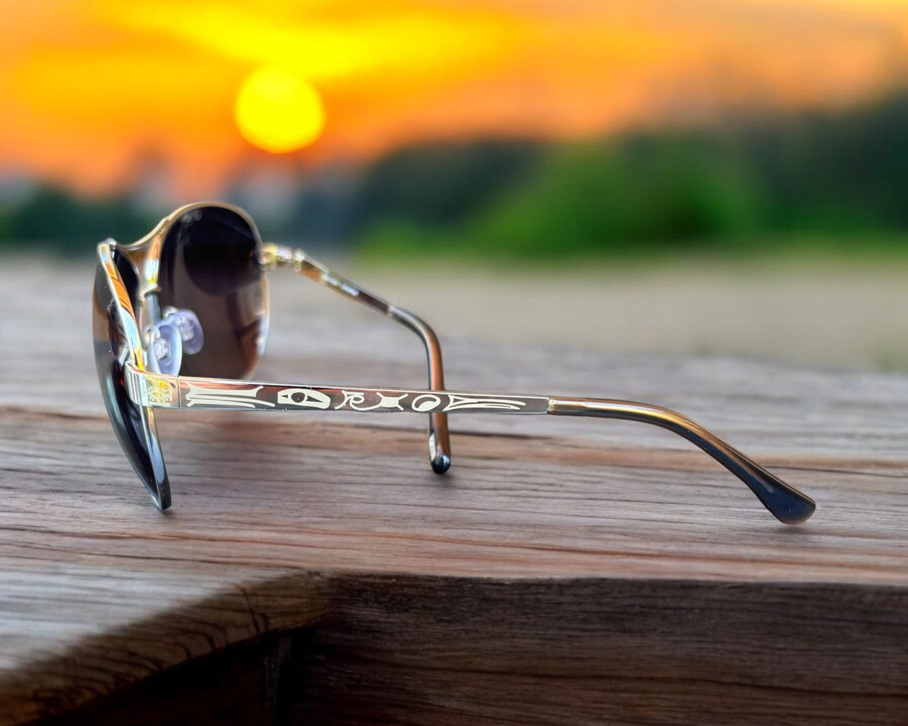 These stylish aviator sunglasses feature the elegant Hummingbird design by acclaimed First Nations artist Corrine Hunt.