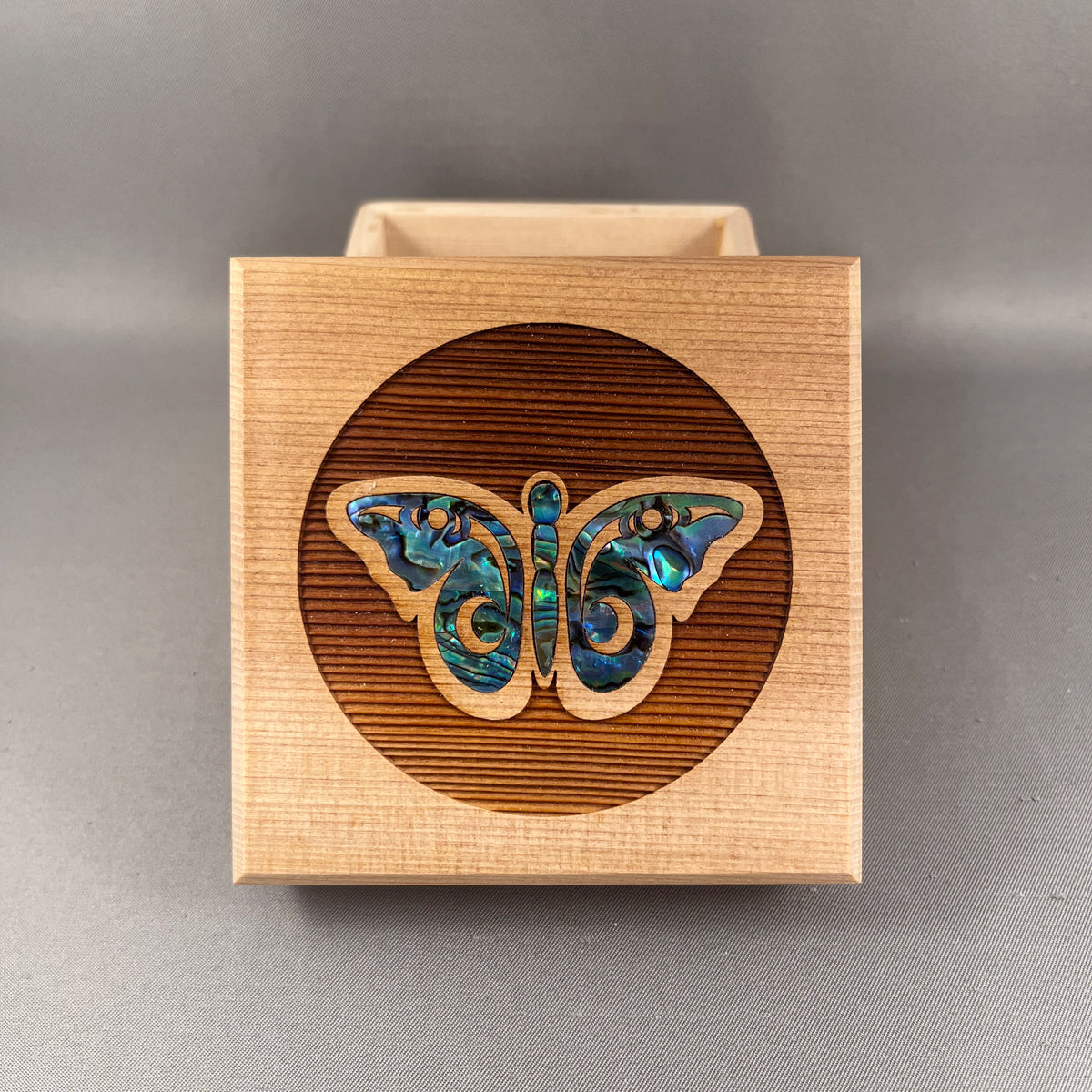 In British Columbia, First Nations Peoples used these unique, and beautifully adorned traditional containers to store our most precious of possessions. These containers are commonly known as “Bentwood Boxes”. Aside from their decor, one of the aspects distinguishing the Bentwood Box from other wooden boxes lies in its construction. The body of the container is constructed using only a single piece of West Coast cedar! The cedar is grooved on the corners and thoroughly steamed in order to painstakingly bend the piece into what you see before you.