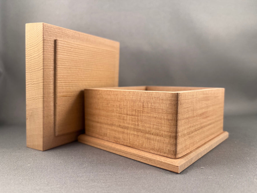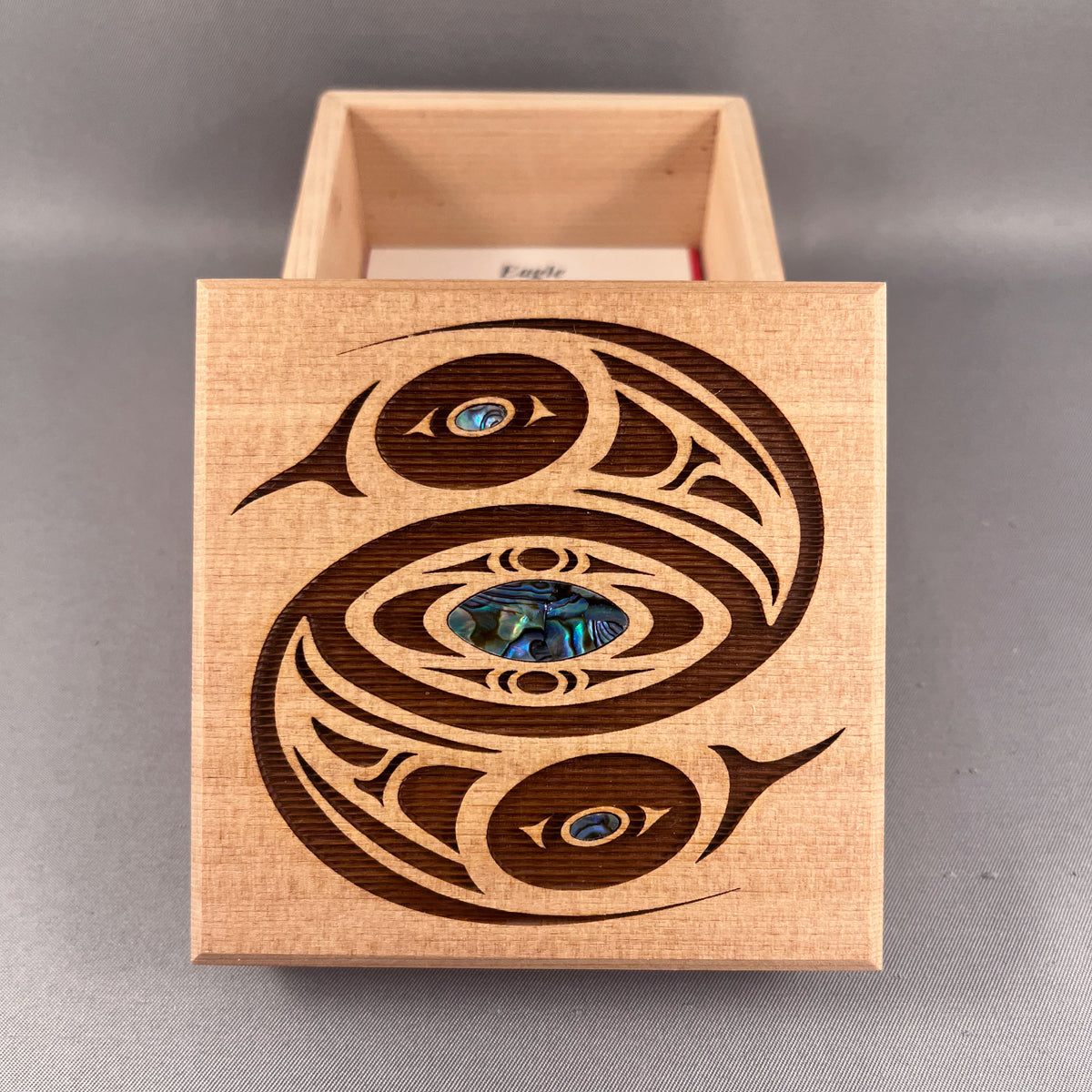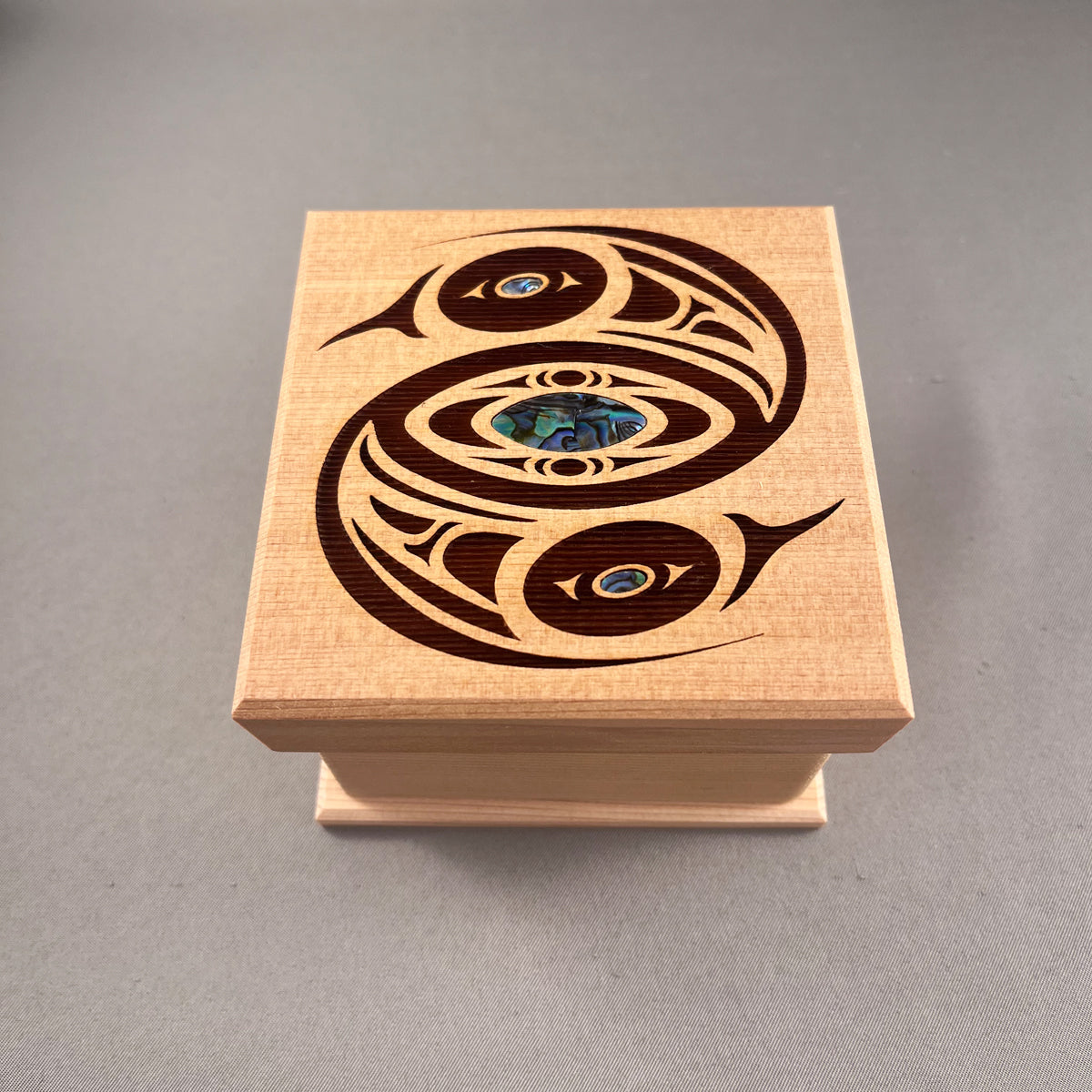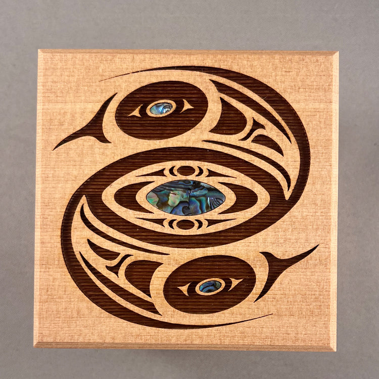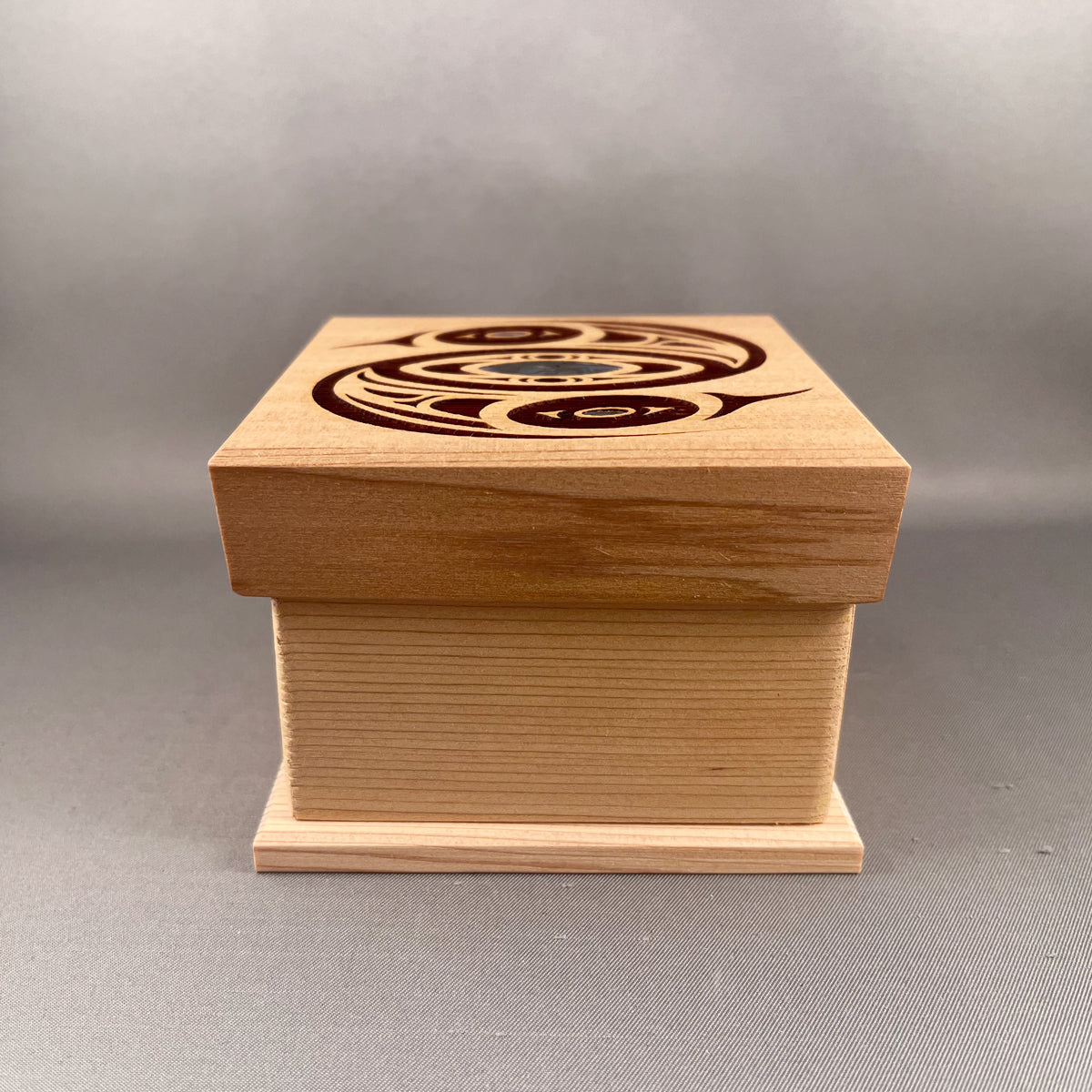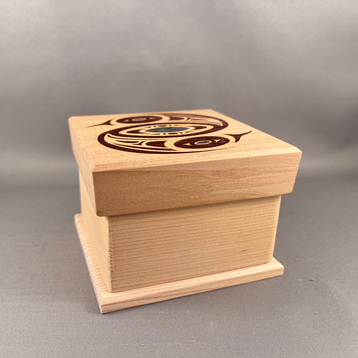 In British Columbia, First Nations Peoples used these unique, and beautifully adorned traditional containers to store our most precious of possessions. These containers are commonly known as “Bentwood Boxes”. Aside from their decor, one of the aspects distinguishing the Bentwood Box from other wooden boxes lies in its construction. The body of the container is constructed using only a single piece of West Coast cedar! The cedar is grooved on the corners and thoroughly steamed in order to painstakingly bend the piece into what you see before you.