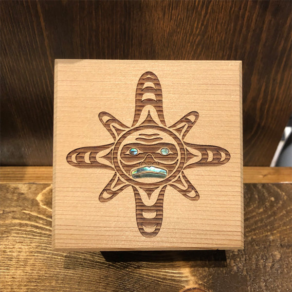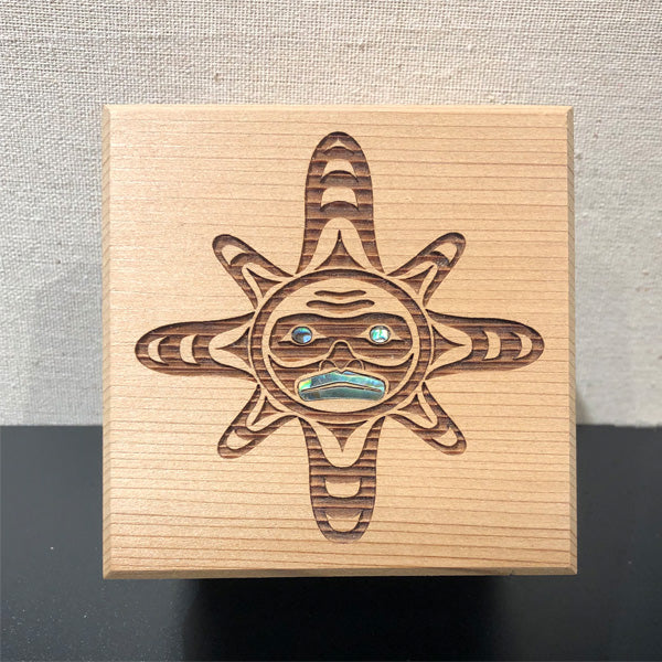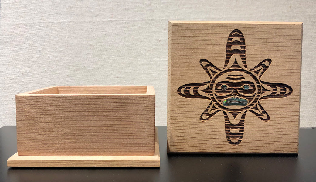 In British Columbia, First Nations Peoples used these unique, and beautifully adorned traditional containers to store our most precious of possessions. These containers are commonly known as “Bentwood Boxes”. Aside from their decor, one of the aspects distinguishing the Bentwood Box from other wooden boxes lies in its construction. The body of the container is constructed using only a single piece of West Coast cedar! The cedar is grooved on the corners and thoroughly steamed in order to painstakingly bend the piece into what you see before you.