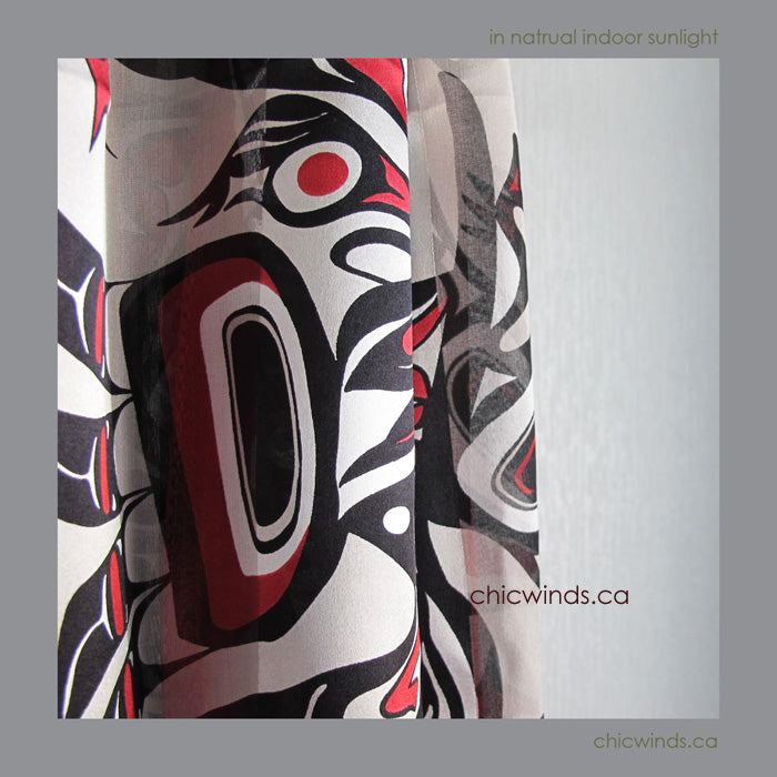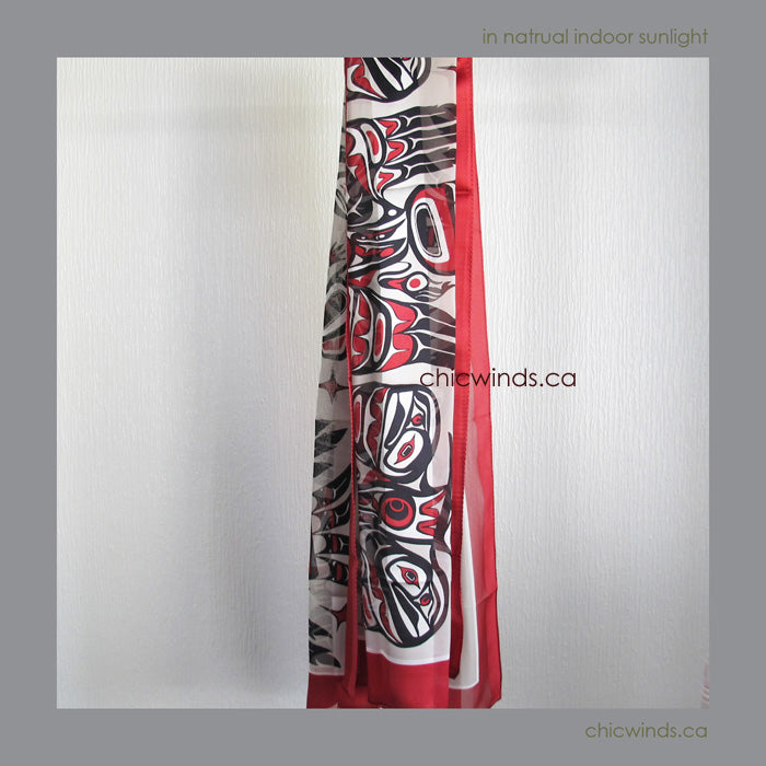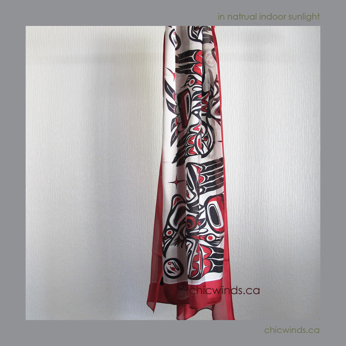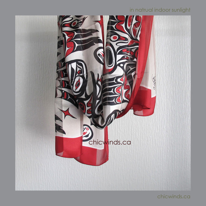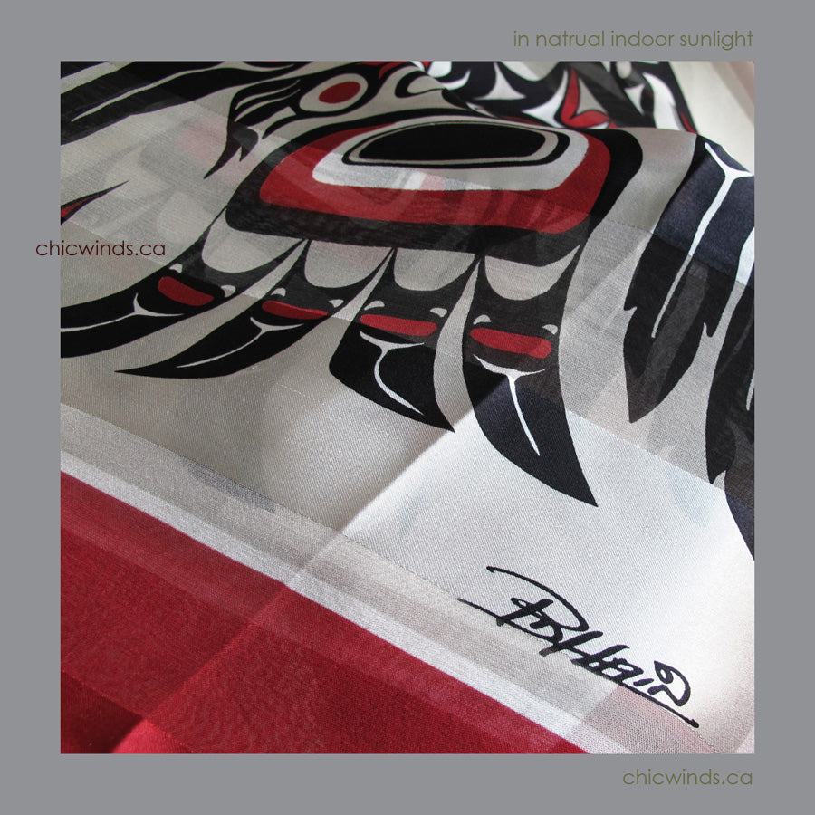 This beautiful silk scarf feature the featuring Raven design by native artist Bill Helin