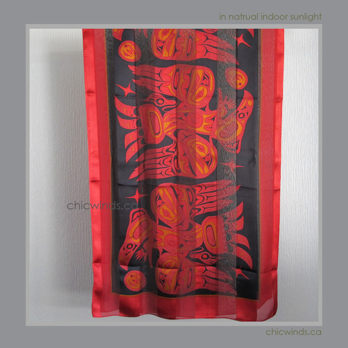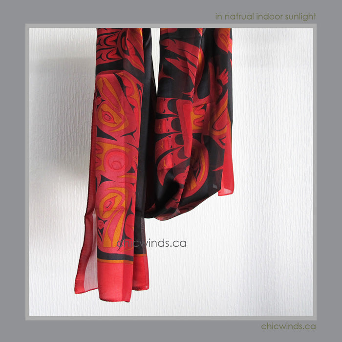 This beautiful silk scarf feature the featuring Raven design by native artist Bill Helin