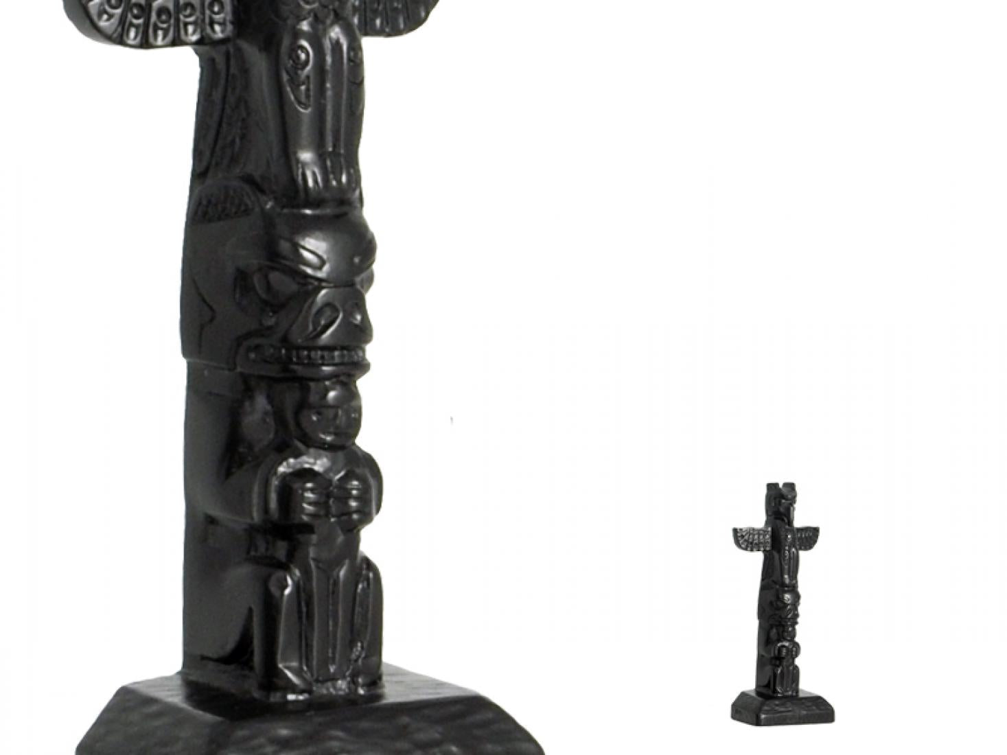 The Northwest Coast Indigenous have a perception of oneness of all earth's creatures, human and animal. They believe that humans may transform into animals, birds, fish and mythical creatures and back again. Once transformed they take on the essence and spirit of that being, Their art reflects this transformation. Made of black crushed marble, this pole features Thunderbird with outstretched wings and Bear.