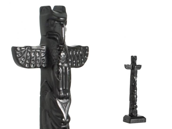 The Northwest Coast Indigenous have a perception of oneness of all earth's creatures, human and animal. They believe that humans may transform into animals, birds, fish and mythical creatures and back again. Once transformed they take on the essence and spirit of that being, Their art reflects this transformation. Made of black crushed marble, this pole features Thunderbird with outstretched wings, Wasco and Bear.
