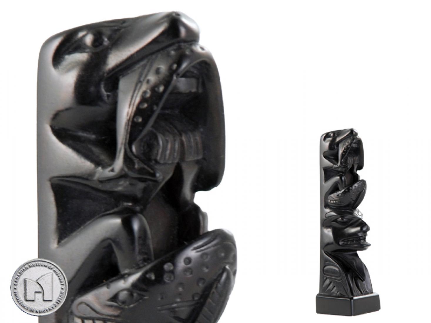 Fine museum reproduction of the Canadian Museum of History Haida Gwaii collection. This pole features the Bear and Halibut and stands 5"" tall. The back of the pole features the museum collection ID number and embedded medallion to authenticate the piece.