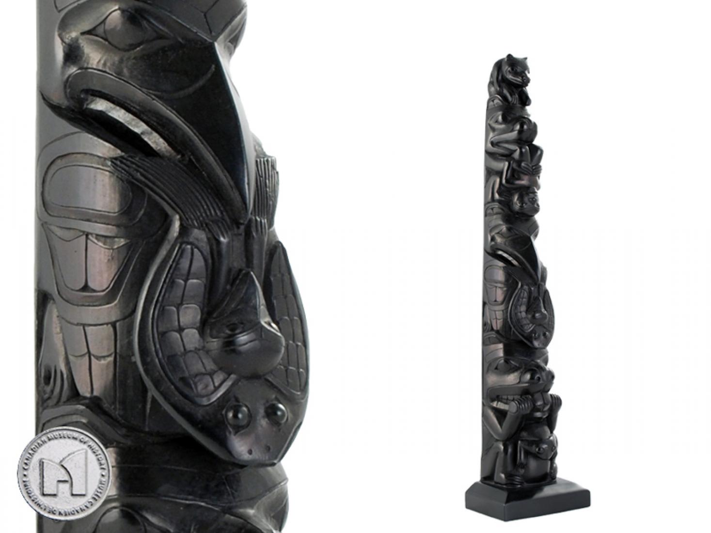 Fine museum reproduction of the Canadian Museum of History Haida Gwaii collection. This pole features Bear Mother and stands 15" tall. The back of the pole features the museum collection ID number and embedded medallion to authenticate the piece.