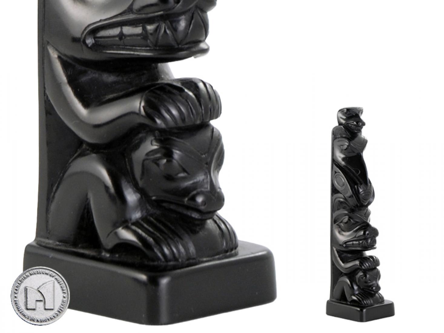 Fine museum reproduction of the Canadian Museum of History Haida Gwaii collection. This pole features the Bear and Raven and stands 7 1/4" tall. The back of the pole features the museum collection ID number and embedded medallion to authenticate the piece.