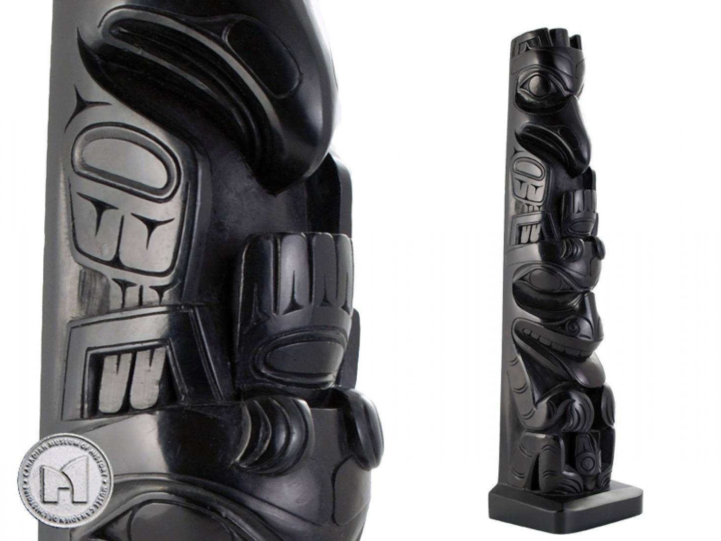 Fine museum reproduction of the Canadian Museum of History Haida Gwaii collection. This pole features Eagle 15"" tall. The back of the pole features the museum collection ID number and embedded medallion to authenticate the piece.