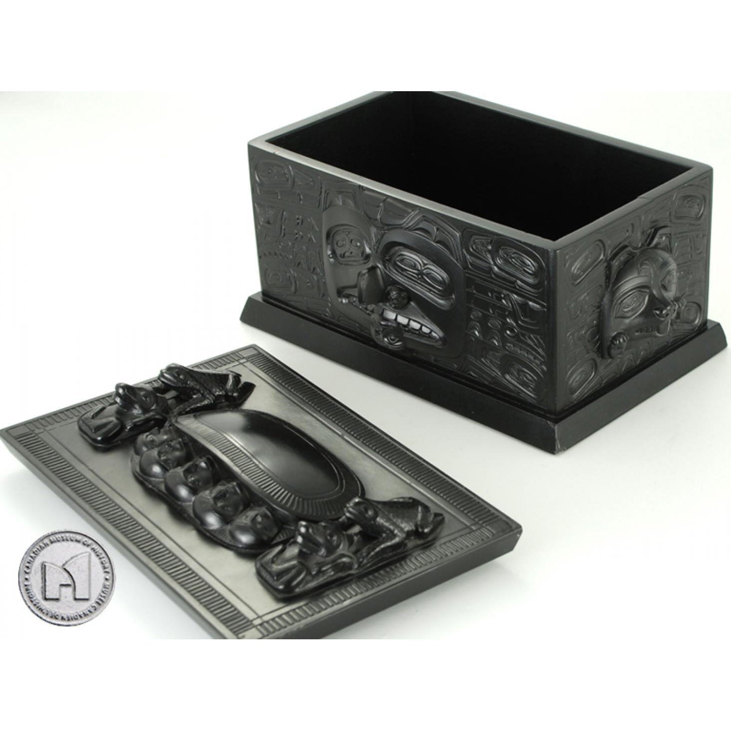 Reproduced under license from the Canadian Museum of History, this box was originally carved by the great Haida artist John Robson, stepfather of the legendary Charles Edenshaw. It is a fine example of the type of Victorian chest that the Haida specialized in during the latter part of the 18th century. Made of a crushed black marble composite to simulate argillite this box has an embedded pewter medallion to authenticate the museum reproduction.