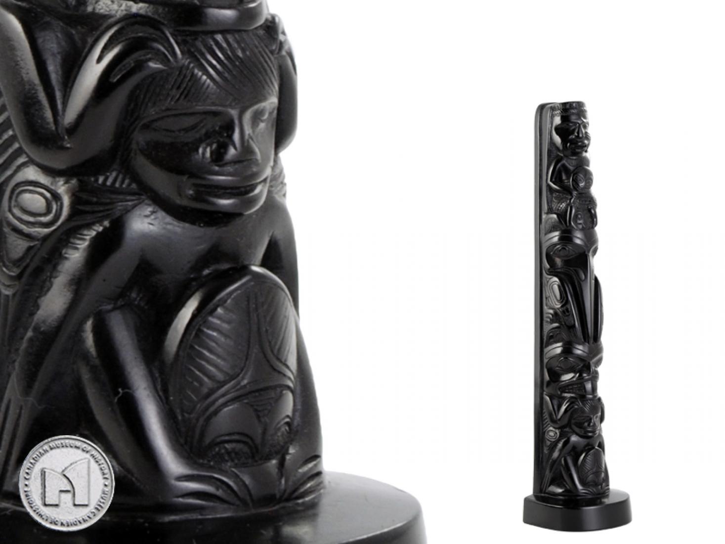 Fine museum reproduction of the Canadian Museum of History Haida Gwaii collection. This pole features Shaman with the Raven and Beaver stands 10"" tall. The back of the pole features the museum collection ID number and embedded medallion to authenticate the piece.