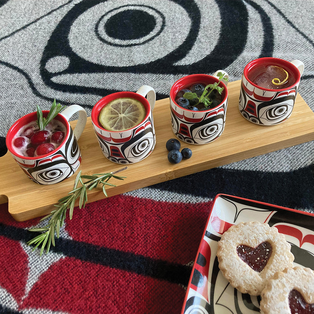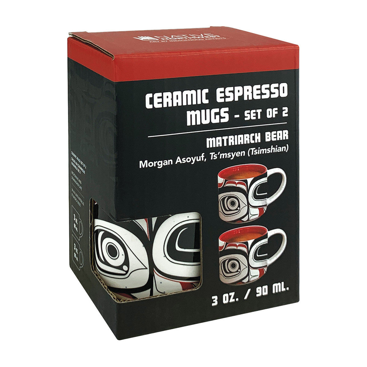 Bold and timeless, this set of 3 oz ceramic espresso mugs features the powerful Matriarch Bear design by Tsimshian artist Morgan Asoyuf. In many Indigenous cultures, the bear symbolizes protection, motherhood, and the strength of lineage — a fitting companion to start your day with quiet confidence.