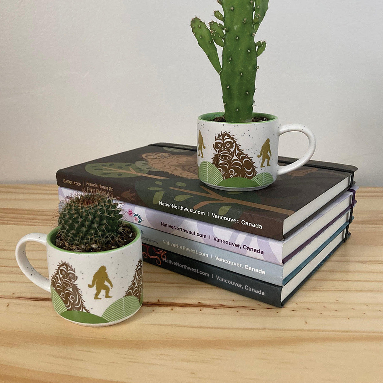 Add a touch of fun to your coffee break with this charming set of ceramic espresso mugs. Featuring a playful Sasquatch design by Coast Salish artist Francis Horne Sr., these 3 oz mugs combine a speckled matte finish with a bold green glossy interior for a fresh, earthy look.