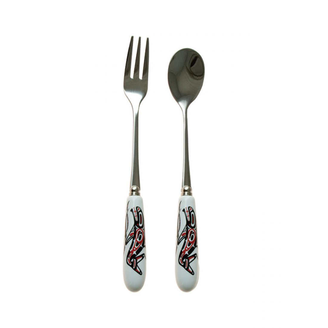 Ceramic and Stainless Steel Fork and Spoon Set with Killer Whale design by artist Corrine Hunt.
