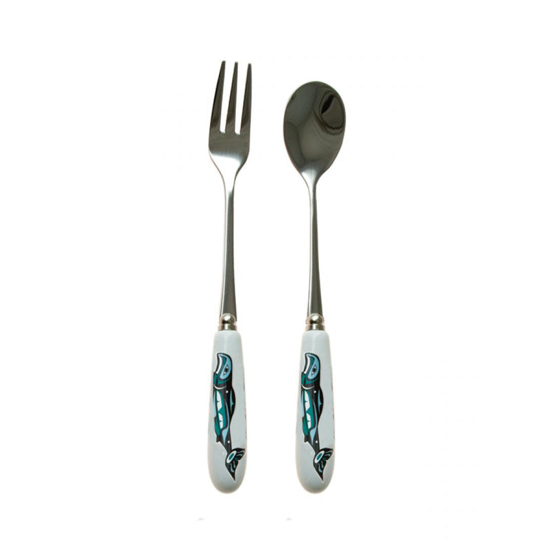 Ceramic and Stainless Steel Fork & Spoon Set with Salmon design by artist Anthony Joseph.