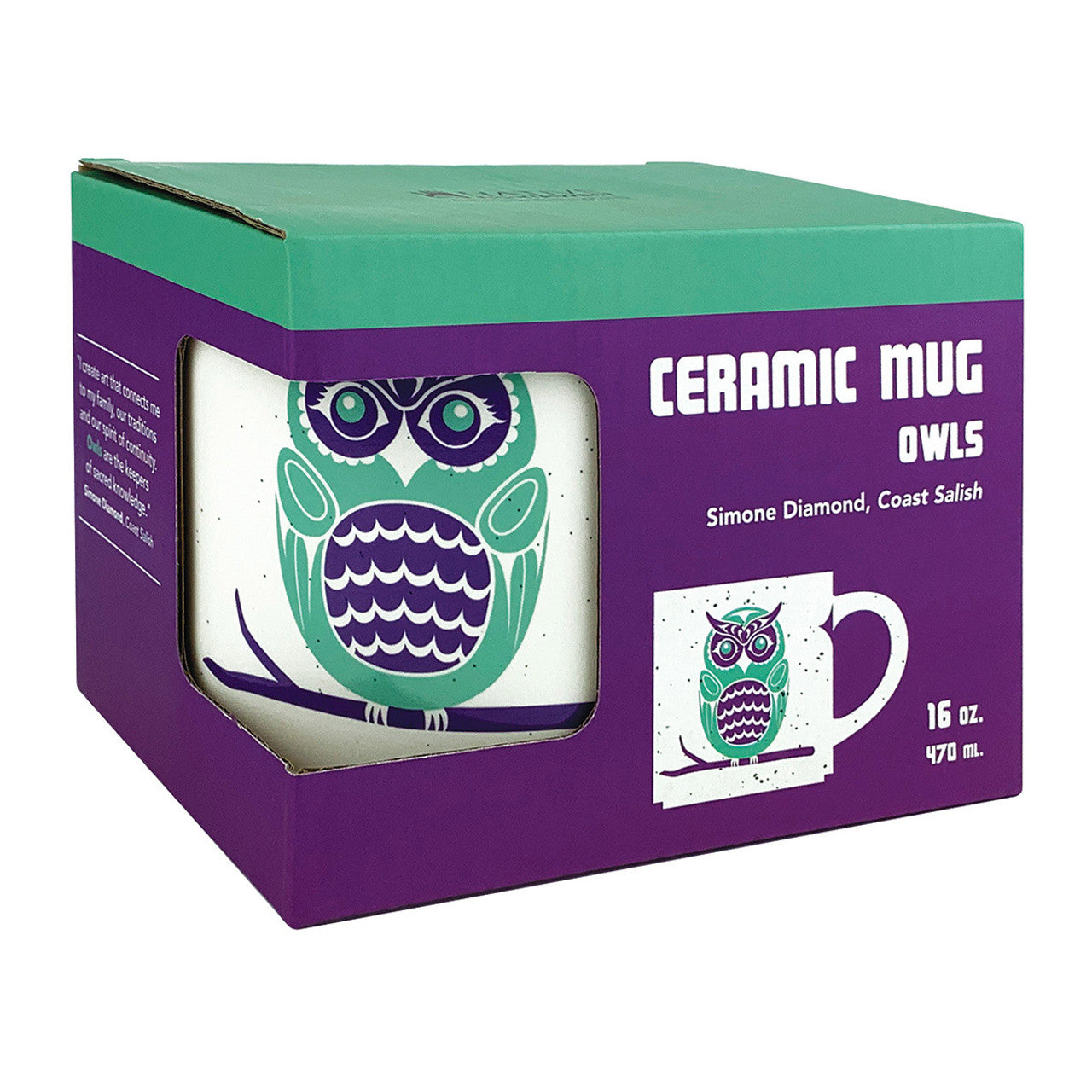 Start your day with a sense of calm and wisdom. This 16 oz ceramic mug features a charming owl design by Coast Salish artist Simone Diamond, brought to life through vibrant colours and clean graphic lines. The soft speckled matte exterior and glossy interior create a pleasing contrast, making it as delightful to hold as it is to behold.