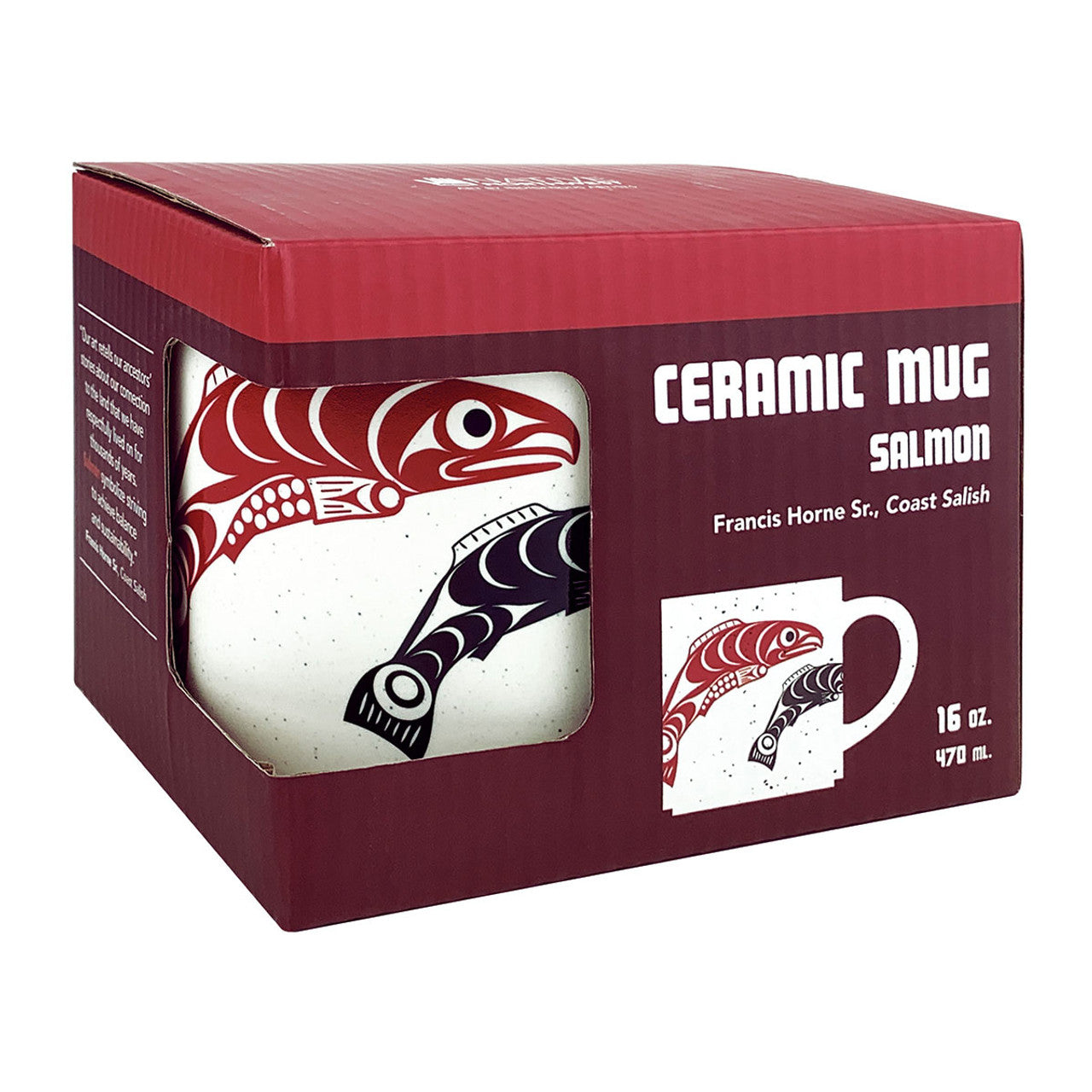 This 16 oz ceramic mug features an original Indigenous artwork Salmon by Coast Salish artist Francis Horne Sr.. known as the provider, salmon embodies the spirit of prosperity, instinct, endurance, and dependability.