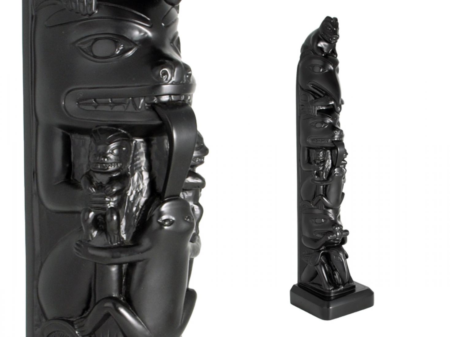 The Northwest Coast Natives have a perception of oneness of all earth's creatures, human and animal. They believe that humans may transform into animals, birds, fish and mythical creatures and back again. Once transformed they take on the essence and spirit of that being, Their art reflects this transformation. Made of black crushed marble, this pole is carved in the style of Chapman and featuring Bear, Raven, Bear Mother with cubs intertwined with Frog, Beaver with Raven.