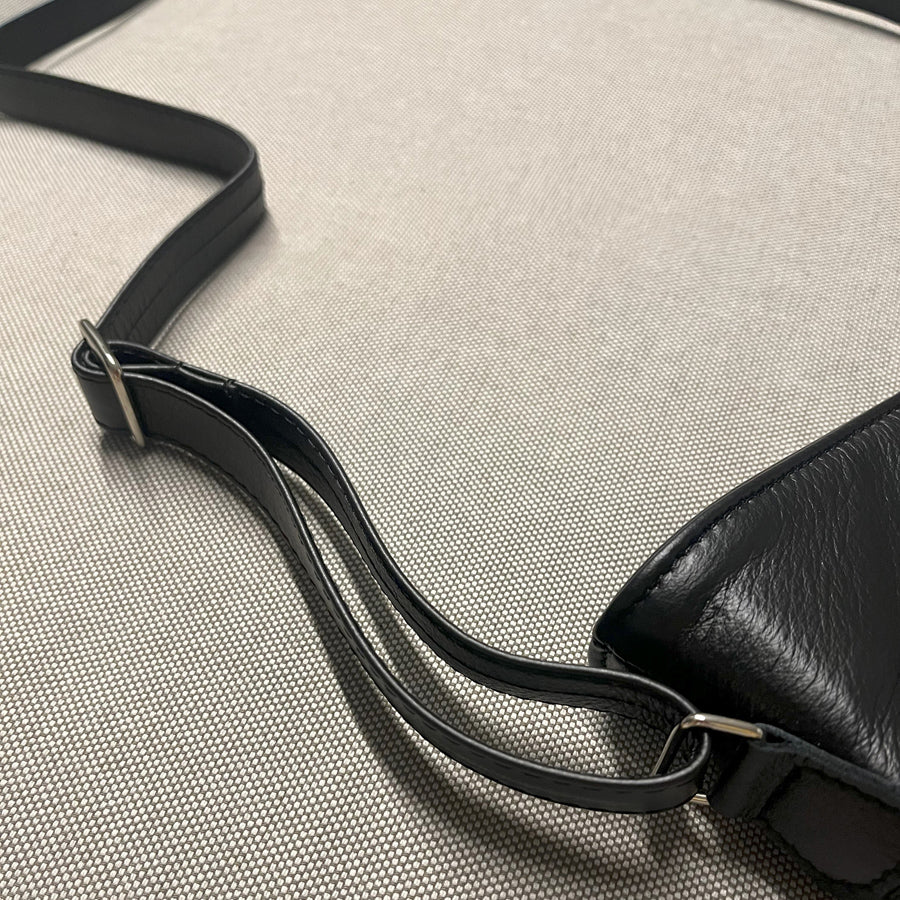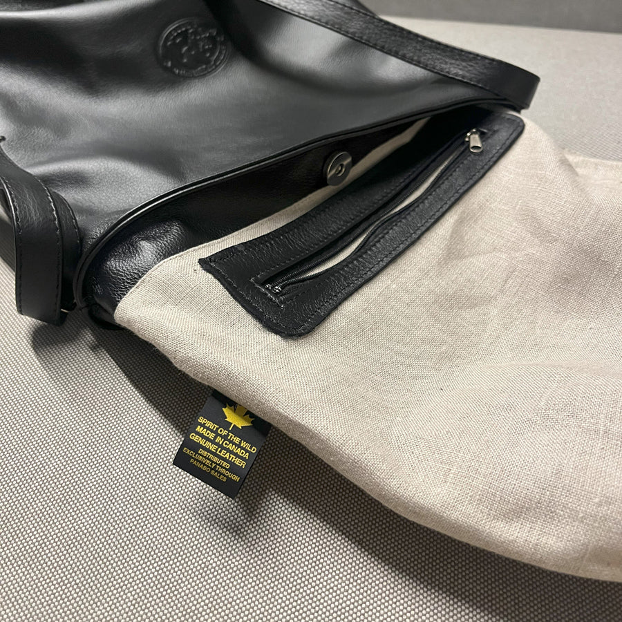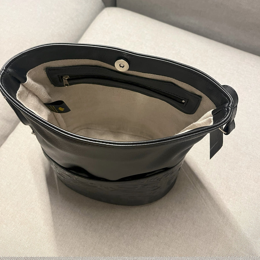 Made with genuine black leather and a soft cotton-linen interior, the bag offers both elegance and utility. The structured form includes side pockets, a secure top snap closure, and an inner zip pocket to keep your belongings organized.