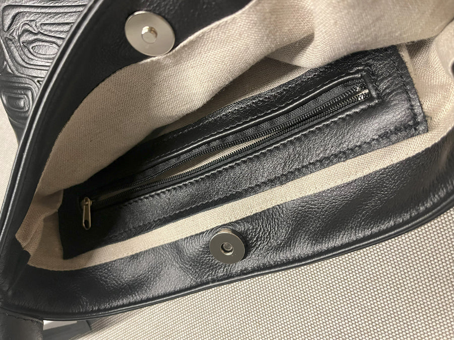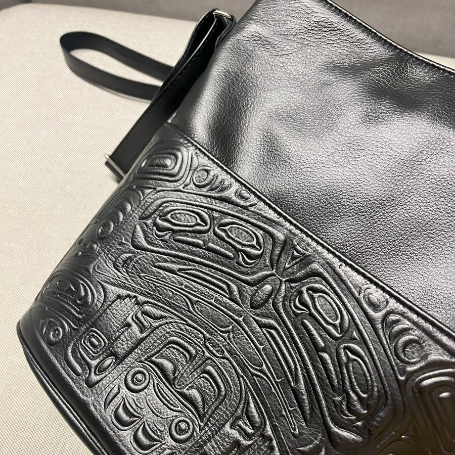 This handcrafted leather bag is both an everyday essential and a wearable artwork. Featuring the Bear Box motif by Indigenous artist Clifton Fred, the embossed design draws from Northwest Coast Indigenous symbolism—evoking protection, reflection, and quiet strength.