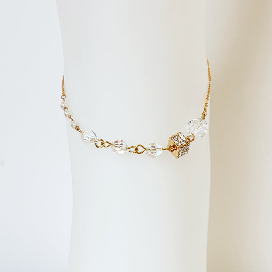 Graceful, radiant, and subtly playful. This delicate anklet features a sequence of luminous beads made with Swarovski® Elements, accented with a pavé-set square charm and petite pearls for added texture. The result is a lightweight, light-catching piece that adds charm to every step.