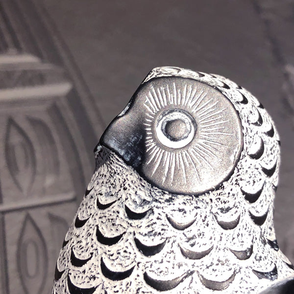 Sculpture of Owl in carved stone styling with intricate detailing.
