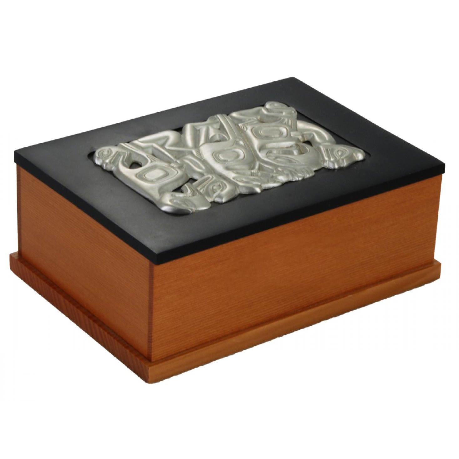 The lid of this fine box features a panel design carved in traditional style and cast fine lead free pewter and mounted onto from crushed black marble lid. This sits on top of a lovely cedar base. Finely crafted.