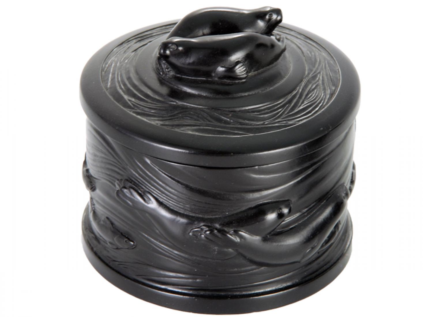 This box is carved in West Coast Native motif and made of a crushed marble composite.