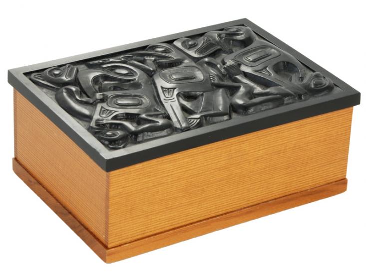 - Inlay panel design carved in traditional style. The lid of this fine box features a panel design carved in traditional style and cast from crushed black marble. It sits on top of a lovely cedar base. This finely crafted box is 100% Canadian made.