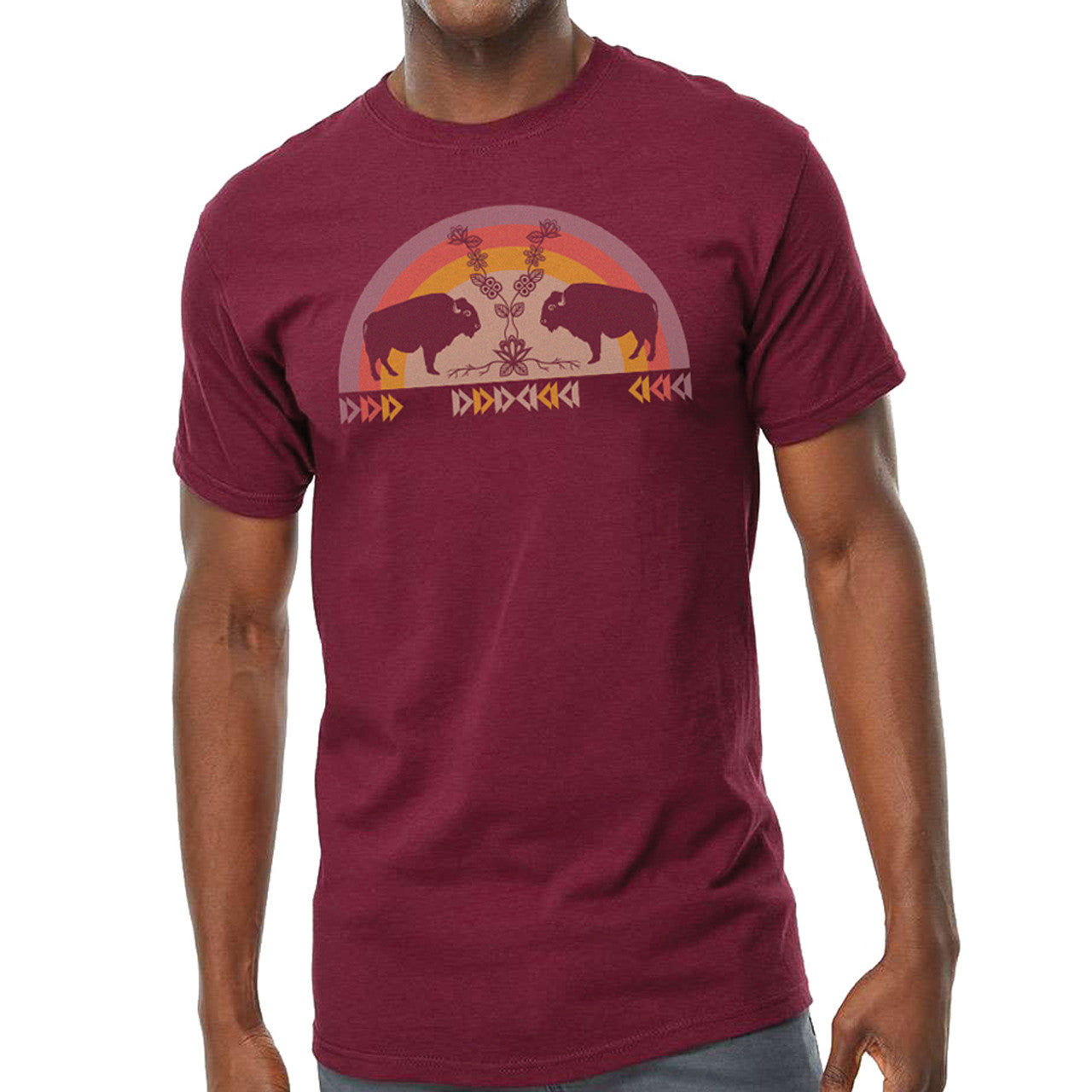 This maroon crew neck graphic t-shirt features the Indigenous design Buffaloes (MashkodeBiizhikina) by Lac Seul First Nation, Ojibwe artist Storm Angeconeb. Made from a comfortable, high-quality cotton blend