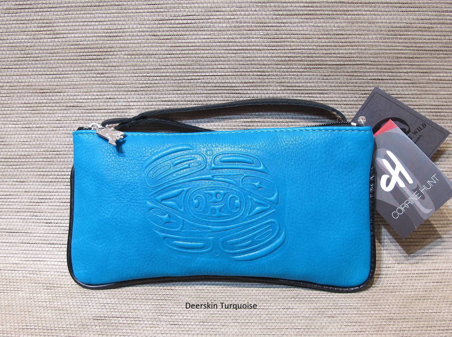 Embossed Leather Wristlet Pouch with Raven Design by Corrine Hunt, Turquoise, Deer Skin