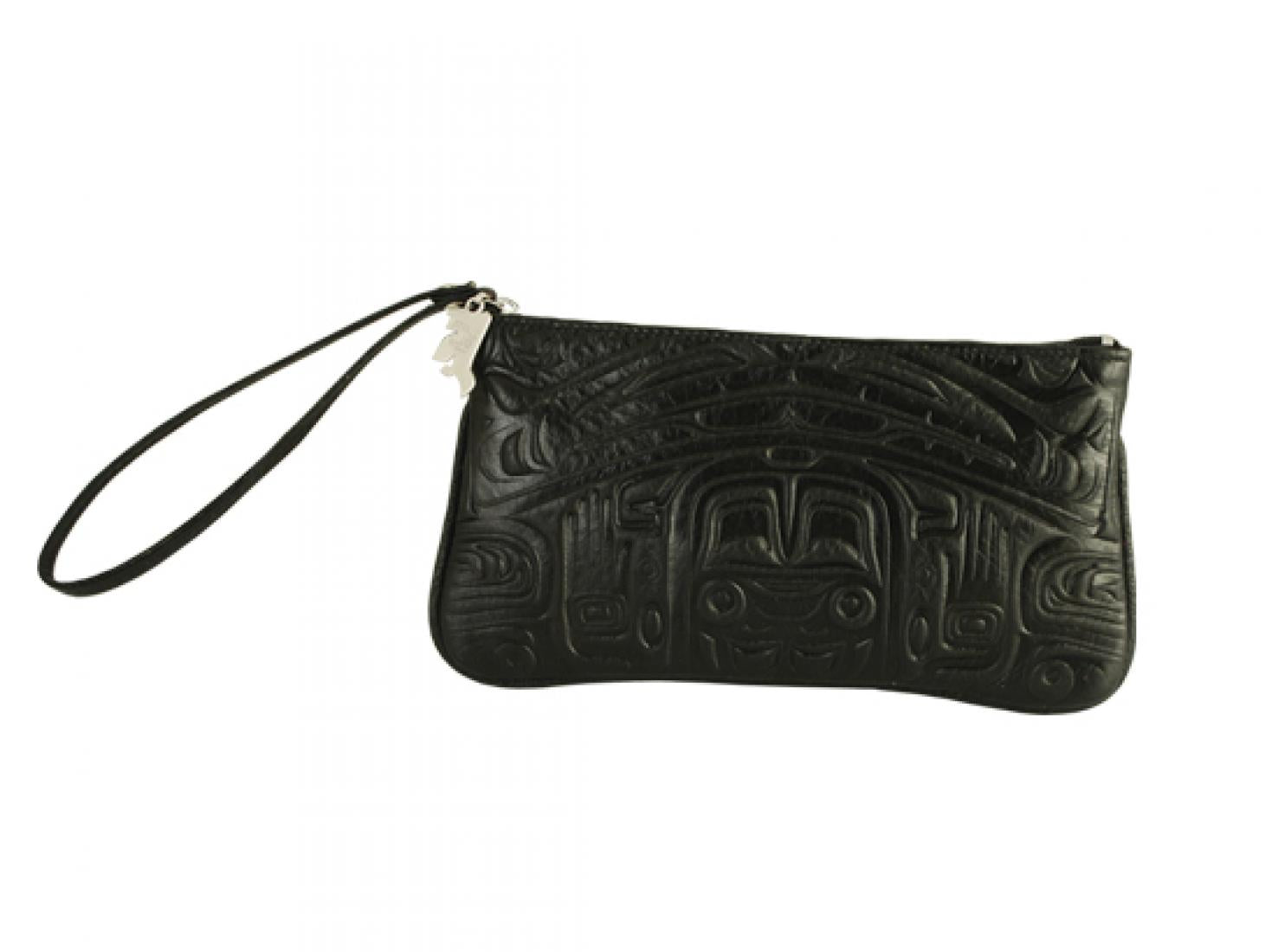 Embossed Leather Wristlet Pouch with Bear Box Design by Clifton Fred, Black