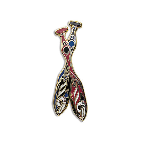 This salmon paddles pin designed by artist Paul Windsor is detailed with polished enamel inlays. Wear it on your lapel, backpack or messenger bag as wearable art. They feature exceptional detail to show the intricate Indigenous artwork of the Pacific Northwest.