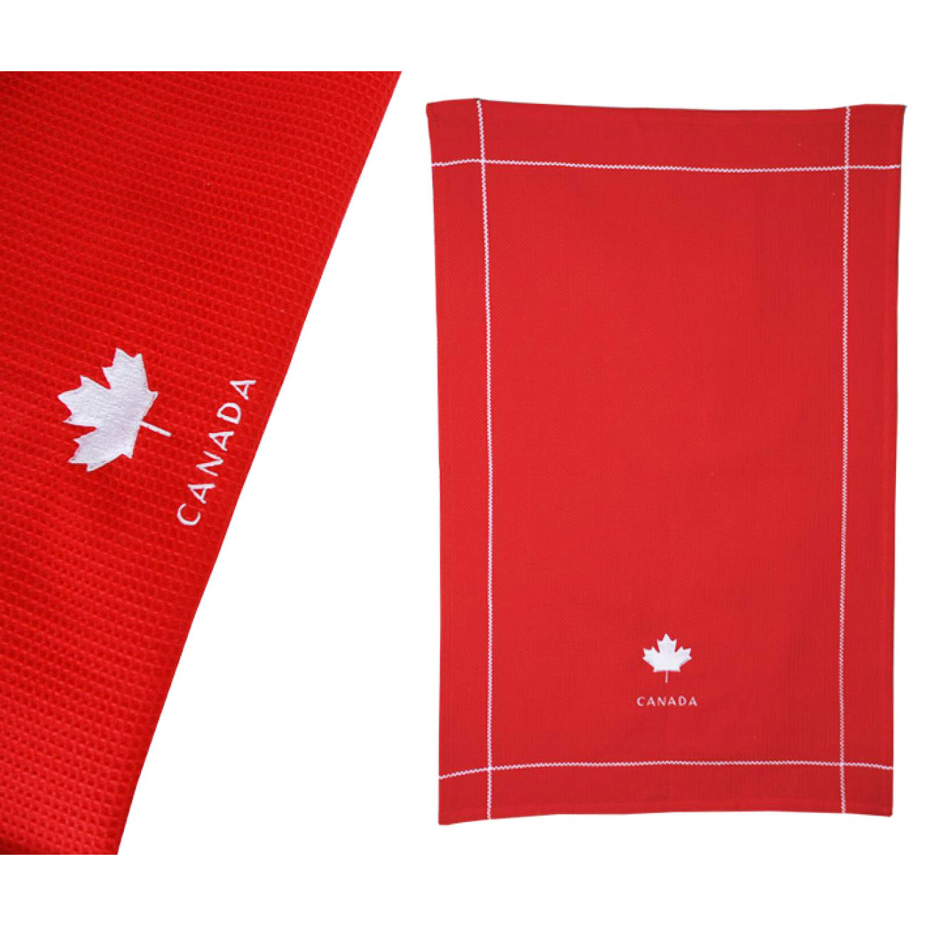 Red embroidered waffle Tea Towel with white Flag leaf design.