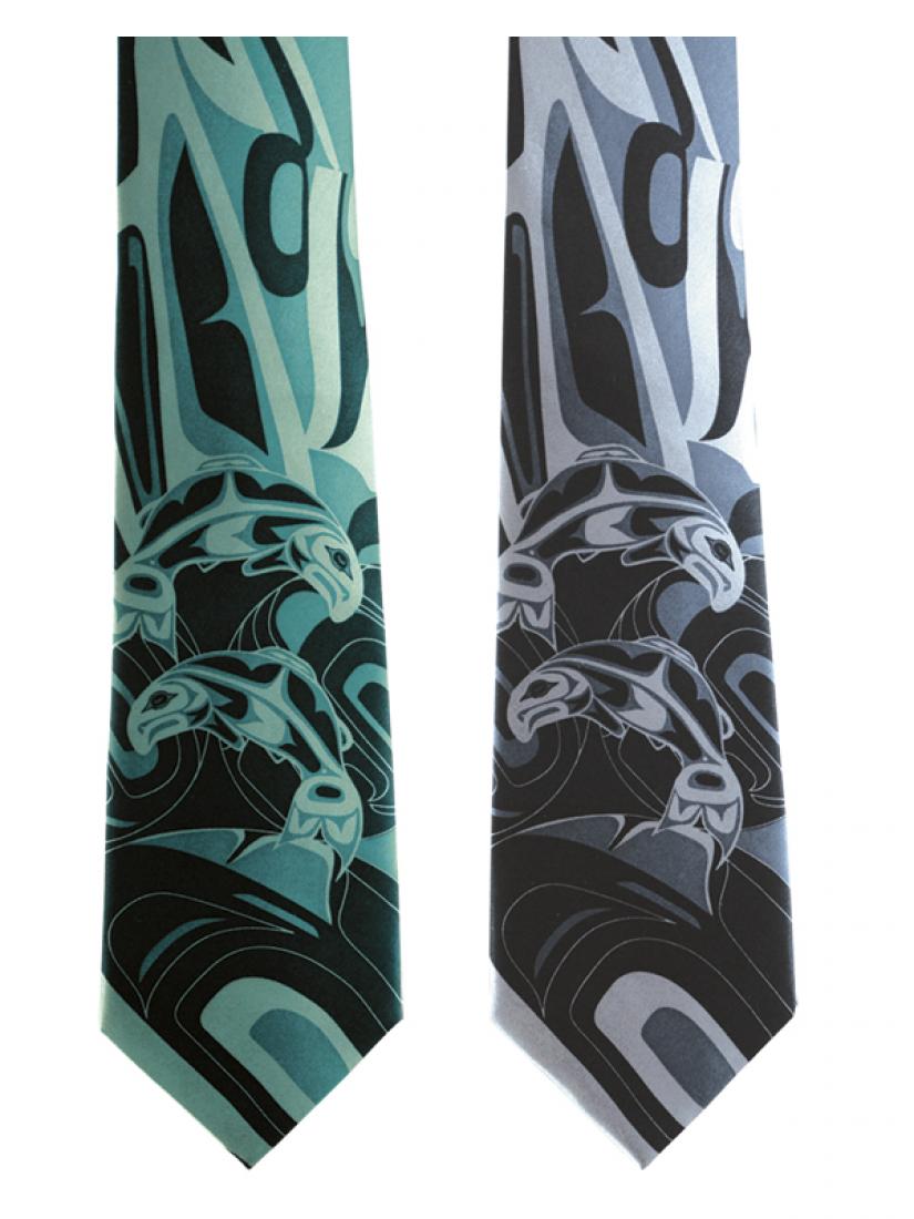 Boxed Silk Tie with First Nation Art Salmon design by Anthony Joseph is available in Teal or Grey.