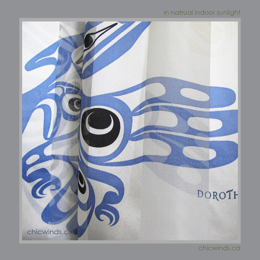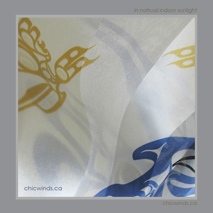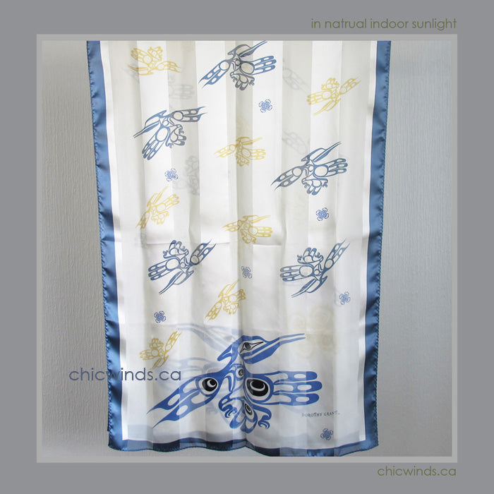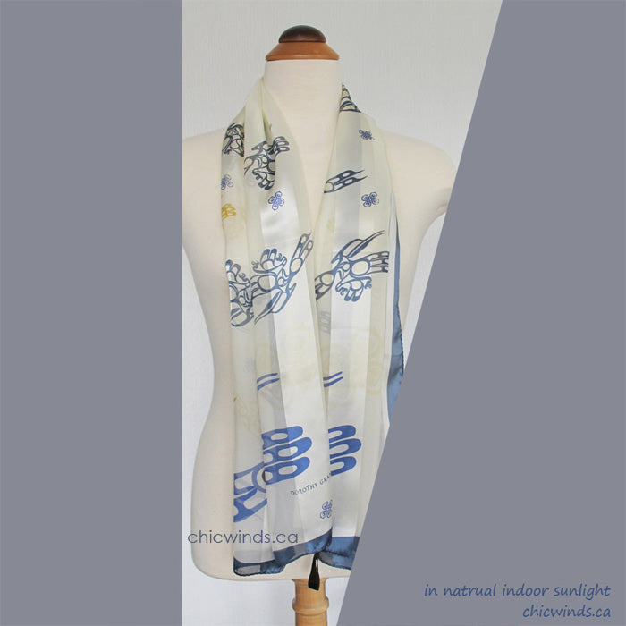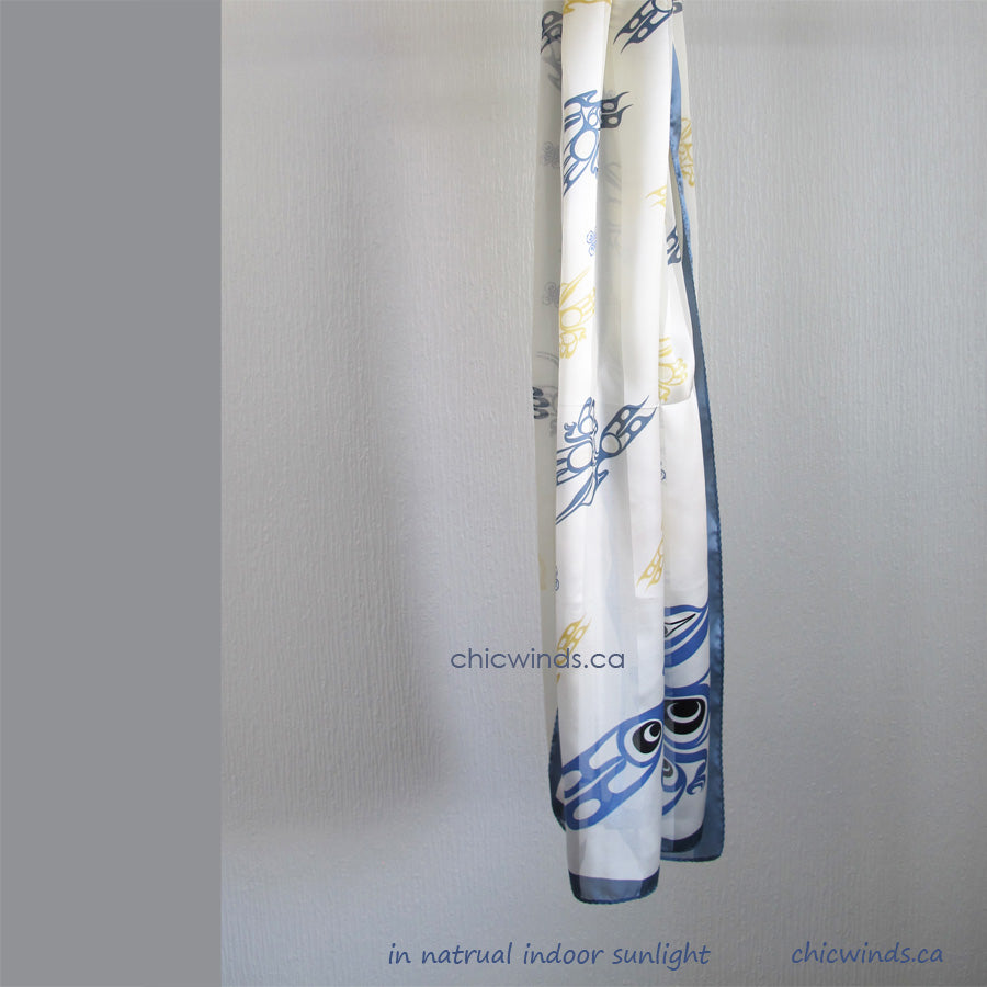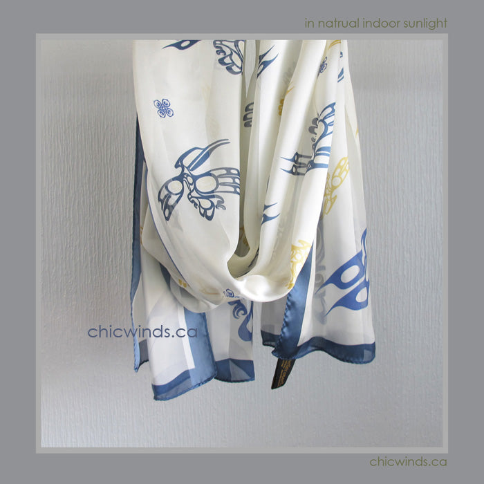 This lustrous silk scarf with original native art printed.
