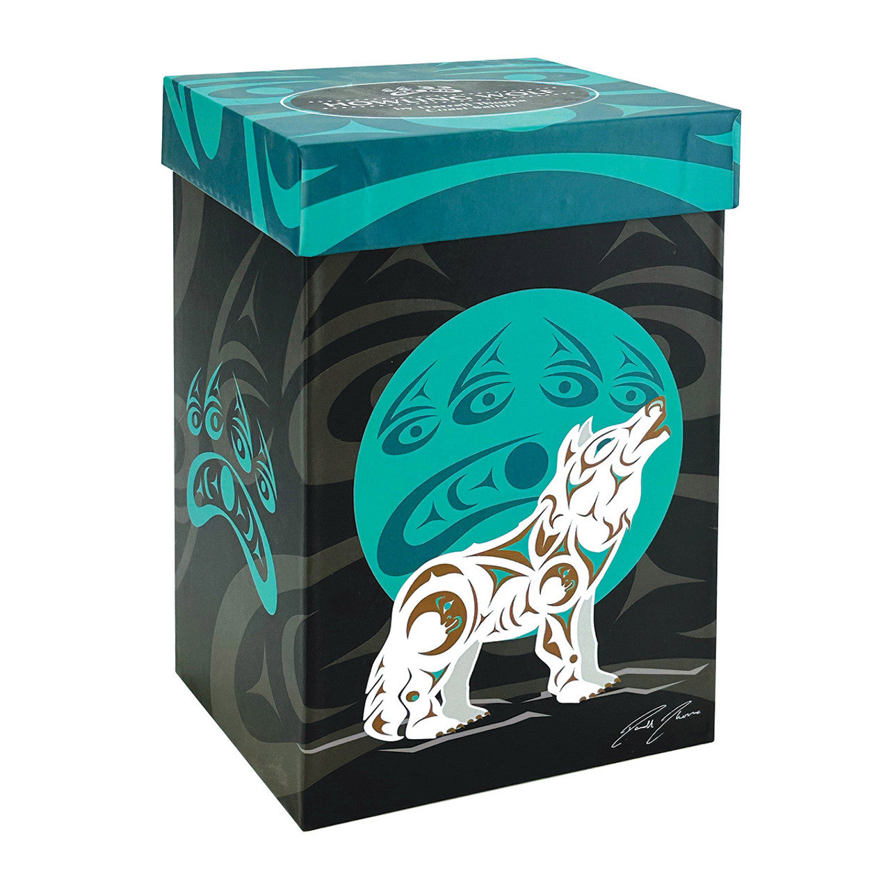 A bold blend of function and storytelling, this travel mug features the powerful silhouette of the wolf — a symbol of intelligence, family, dedication, and faithfulness in Indigenous culture. The deep black ceramic exterior is contrasted by a rich teal interior, echoing the moonlit landscape where the wolf stands watch.