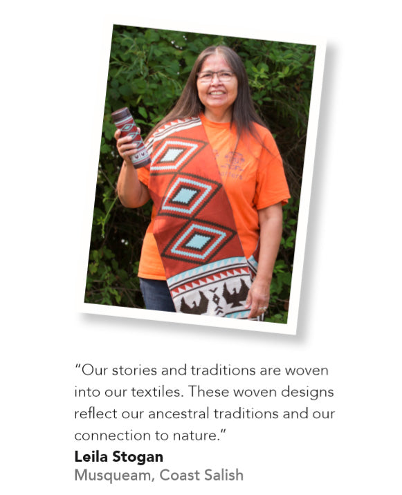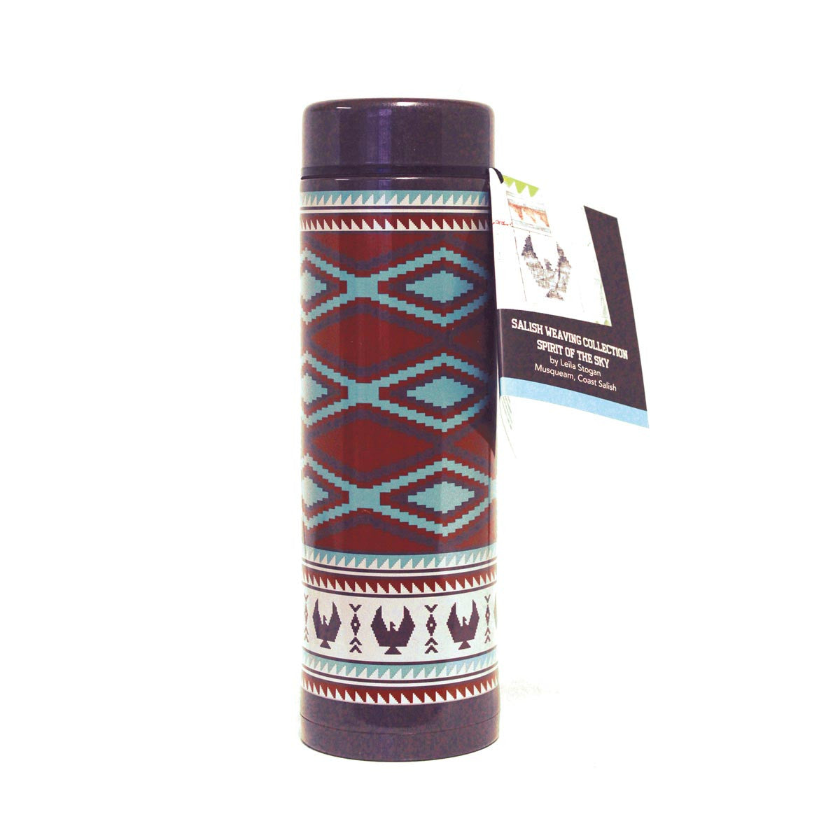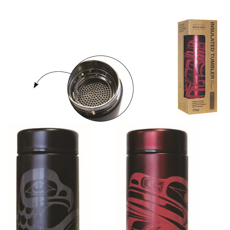 These double walled, high quality 304 food grade stainless steel insulated tumblers come with a removable tea strainer and with screen print artwork. "Spirit of the Sky" by Canadian First Nation artist Leila Stogan, Coast Salish, Musqueam.