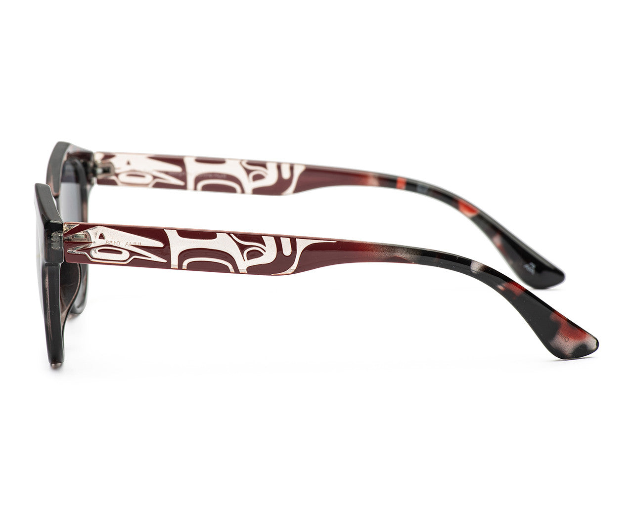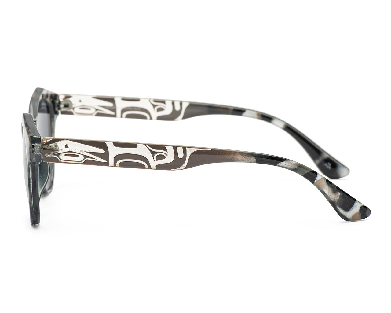 Crafted from durable polycarbonate, the frames offer a comfortable fit and flattering silhouette. While they are not RX compatible, they’re a perfect everyday accessory for sun protection and elevated style. The intricate Indigenous artwork on the arms celebrates Corrine Hunt’s Kwakiutl and Tlingit heritage.