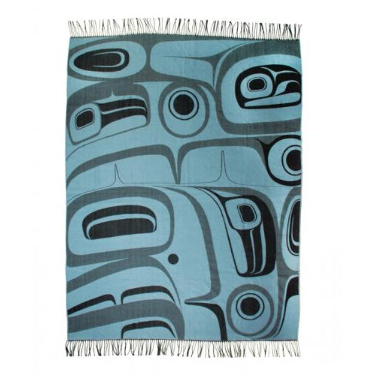 This beautifully woven blanket features the Raven, a symbol of transformation and knowledge, designed by Indigenous artist Kelly Robinson.