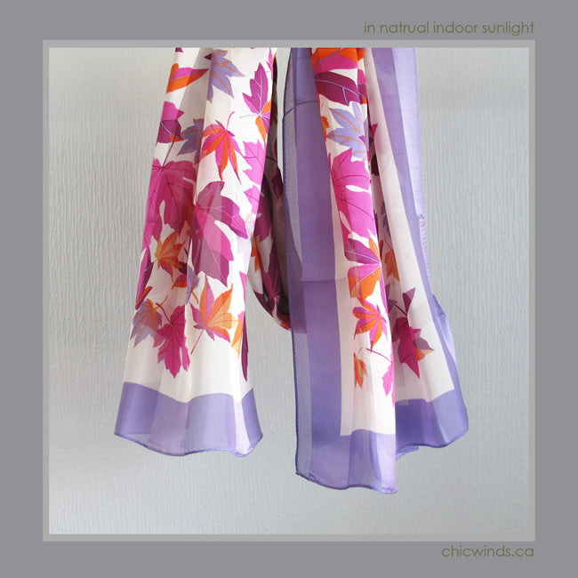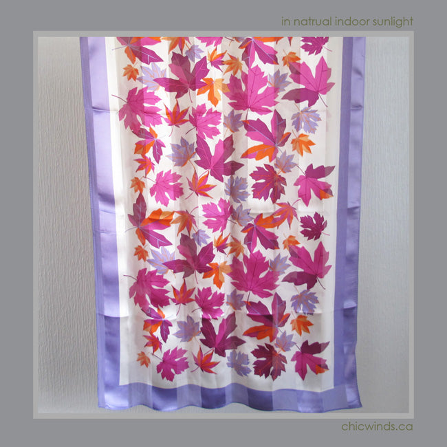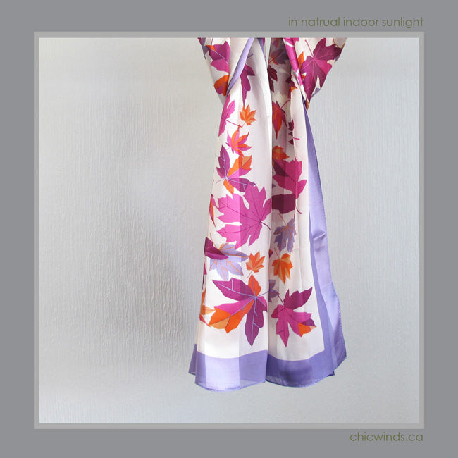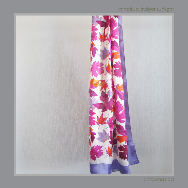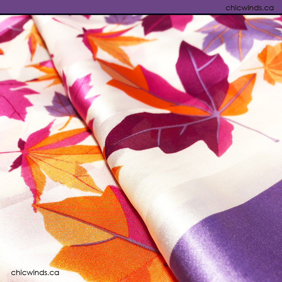 This warm and rich silk satin stripe scarf features signature Maple Leaves Design.