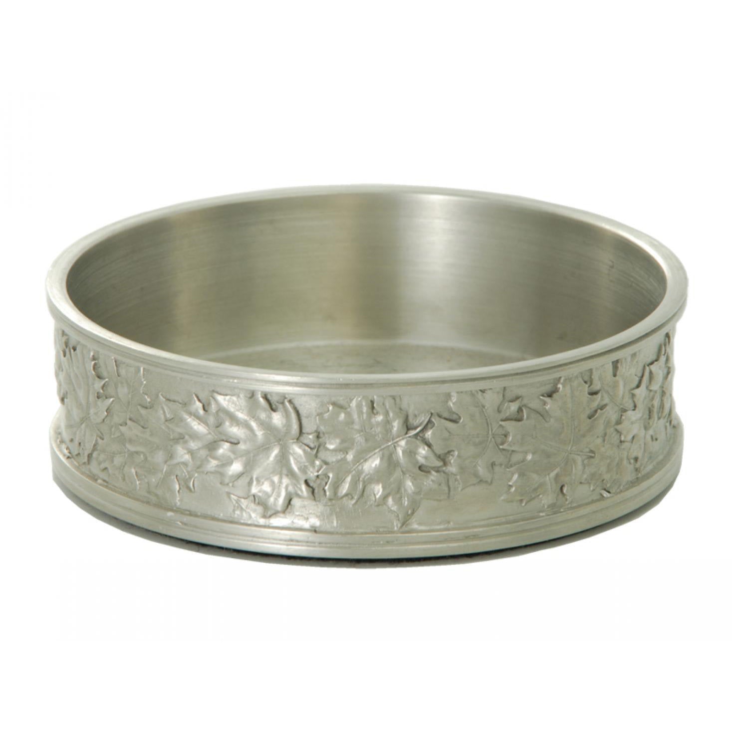 Carved Maple Leaves adorn this pewter wine coaster which serves well as a candle coaster, wine coaster, or other decorative function. Pewter does not tarnish like silver. Wash by hand with mild soap and water. Never place in dishwasher as the detergents are to corrosive for this fine metal.