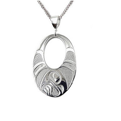 This elegant ovel silver pendant by Bill Helin is made of a special silver and pewter alloy and is presented on a sterling silver chain. This piece is 100% designed and made in Canada.