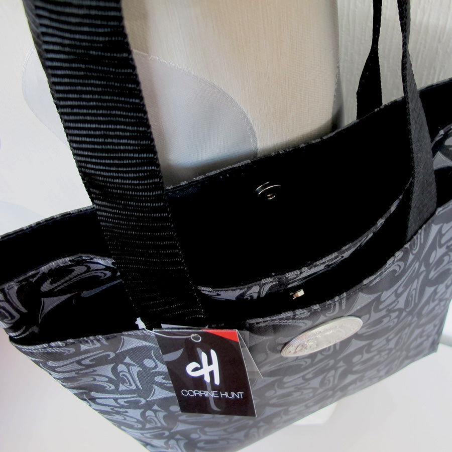 Corrine Hunt artwork "3 Eagle" printed fabric shopper tote bag with pewter accent.