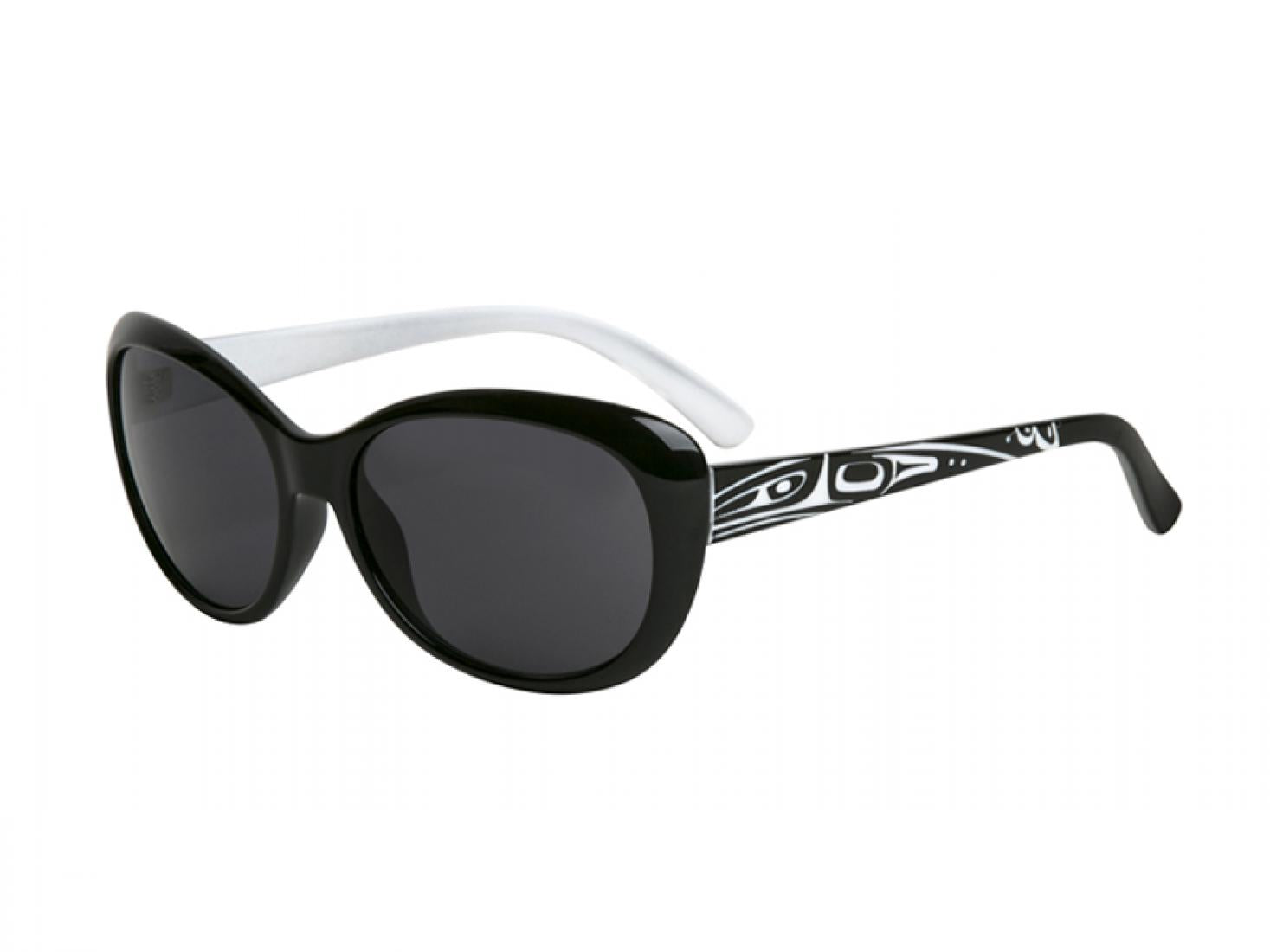 Mid Size ladies Sunglasses "Ruby" is an oversized cat eye that perfectly accentuates the cheekbones and adds a hit of glamour to any occasion or outfit. Featuring a First Nations butterfly design by artist Corrine Hunt. These glasses are double polished for a more lustrous finish and have high-quality hinges for exceptional durability.