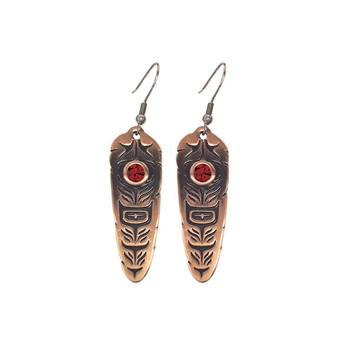 These alluring drop earrings feature engraved Sacred Feather artwork on antique copper plating.