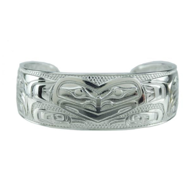 This elegant cuff bracelet showcases a Frog design by Indigenous artist Ben Houstie, known for his refined interpretation of Northwest Coast art. Made in Canada with a blend of sterling silver and pewter alloy,