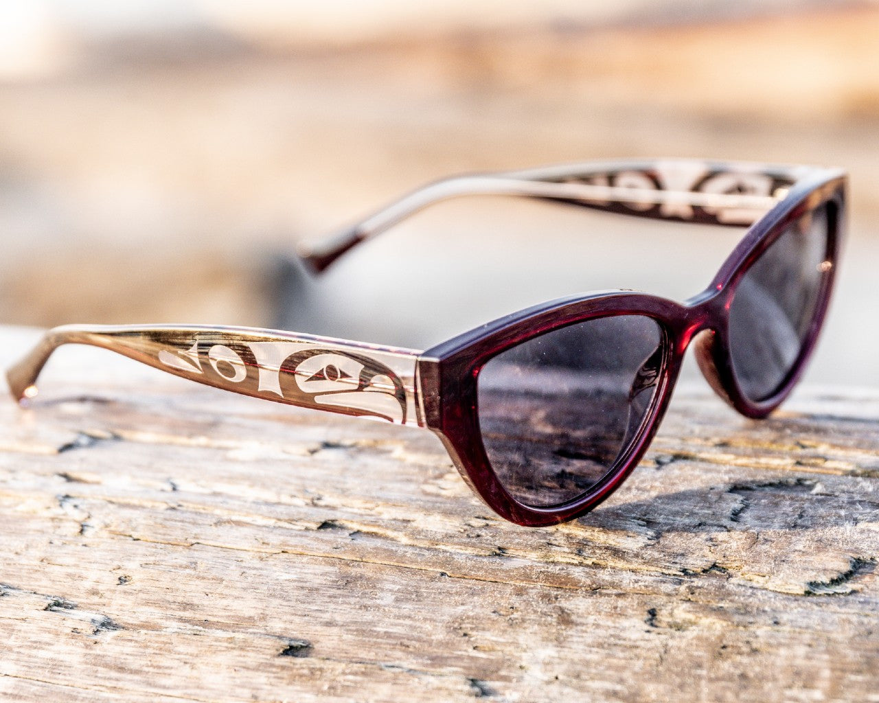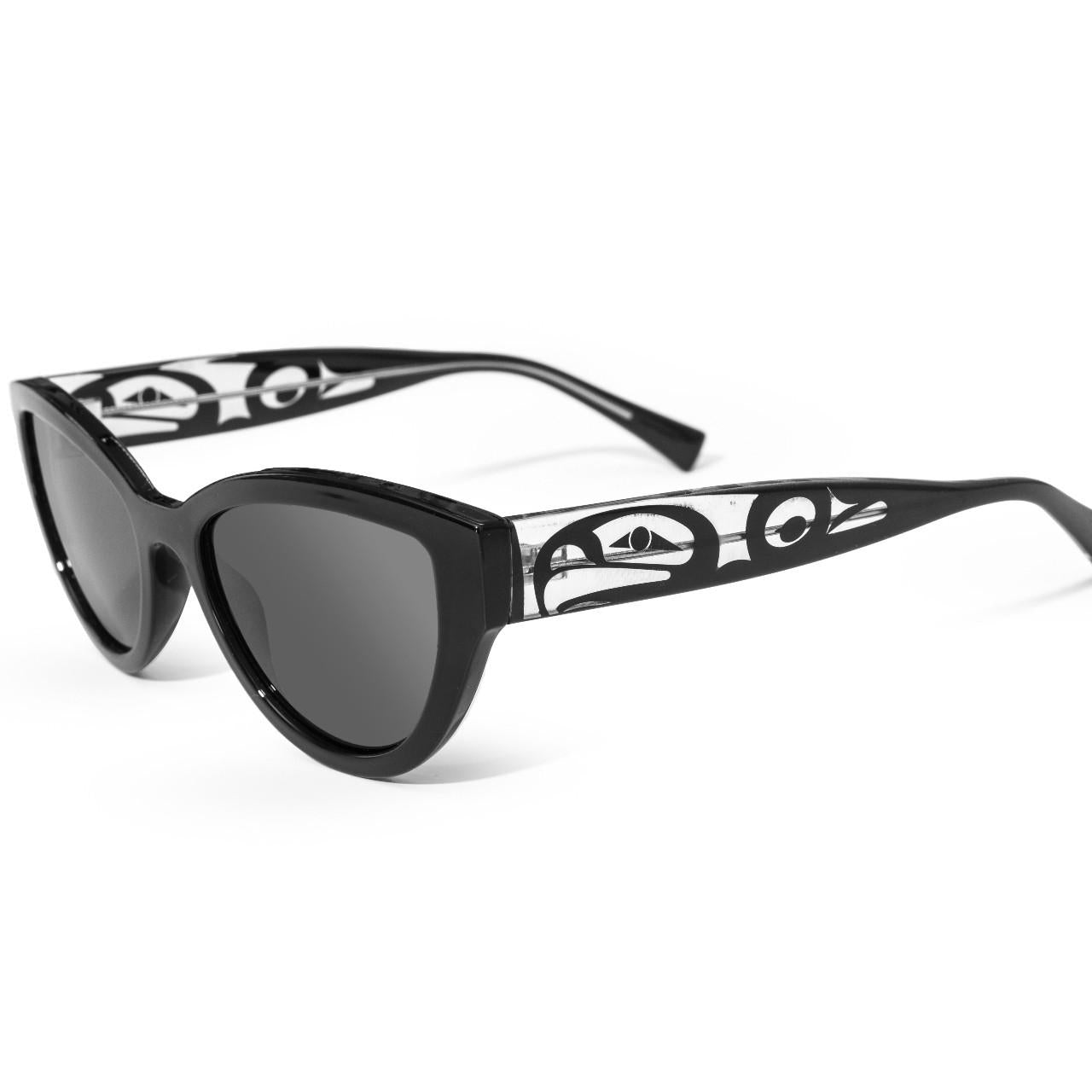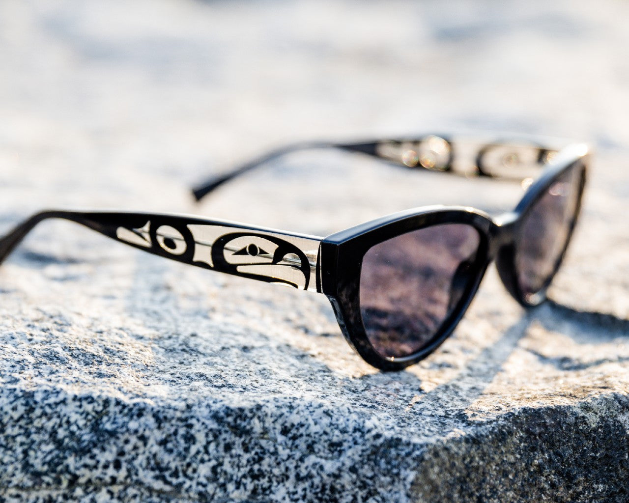 These sleek cat eye sunglasses feature the iconic Eagle motif by celebrated Indigenous artist Corrine Hunt.