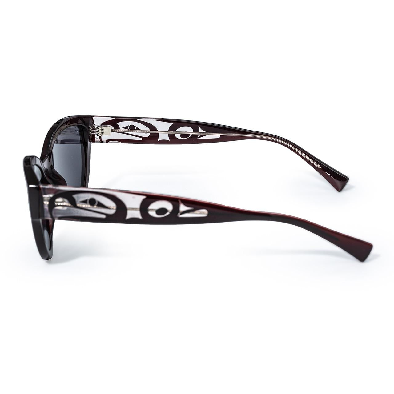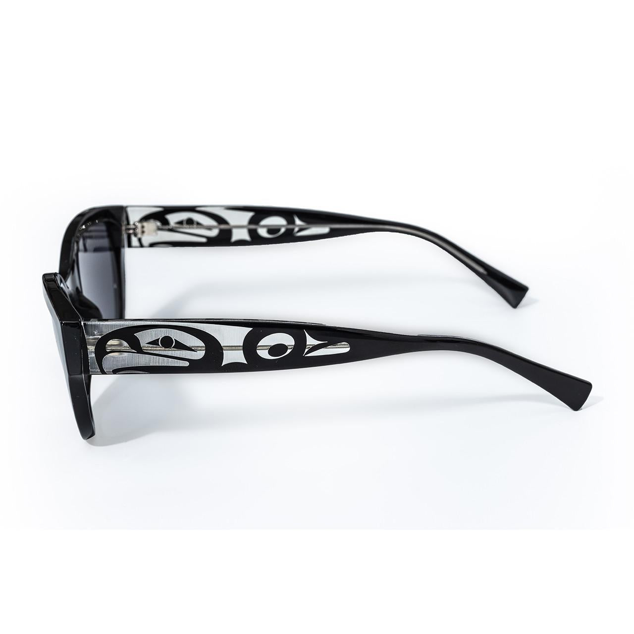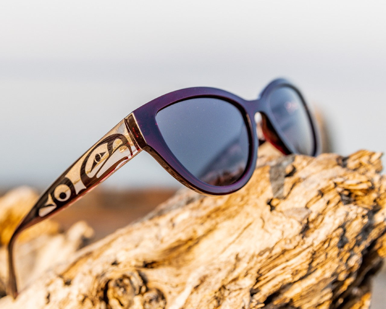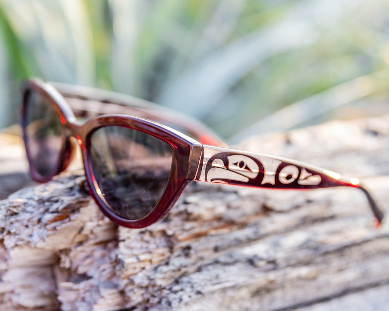 These sleek cat eye sunglasses feature the iconic Eagle motif by celebrated Indigenous artist Corrine Hunt.