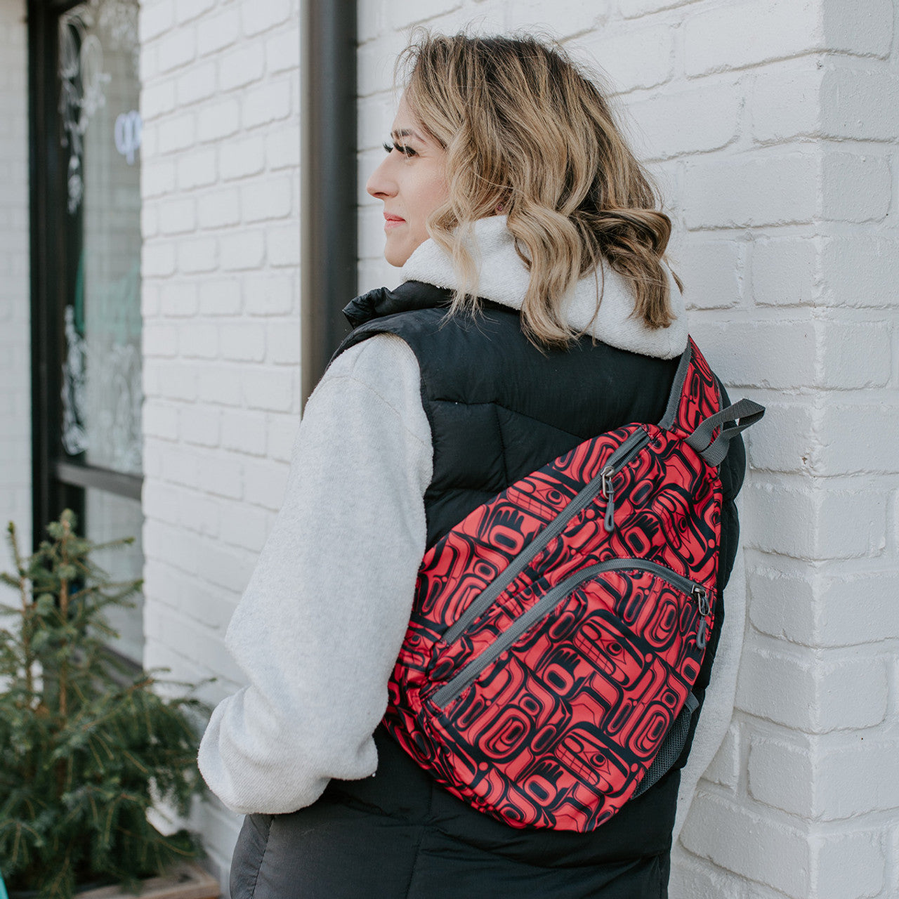 Designed for life on the go, this versatile sling pack combines lightweight durability with smart functionality. Featuring the bold indigenous artwork by Namgis artist Ryan Cranmer, it keeps you organized in style wherever your day leads.
